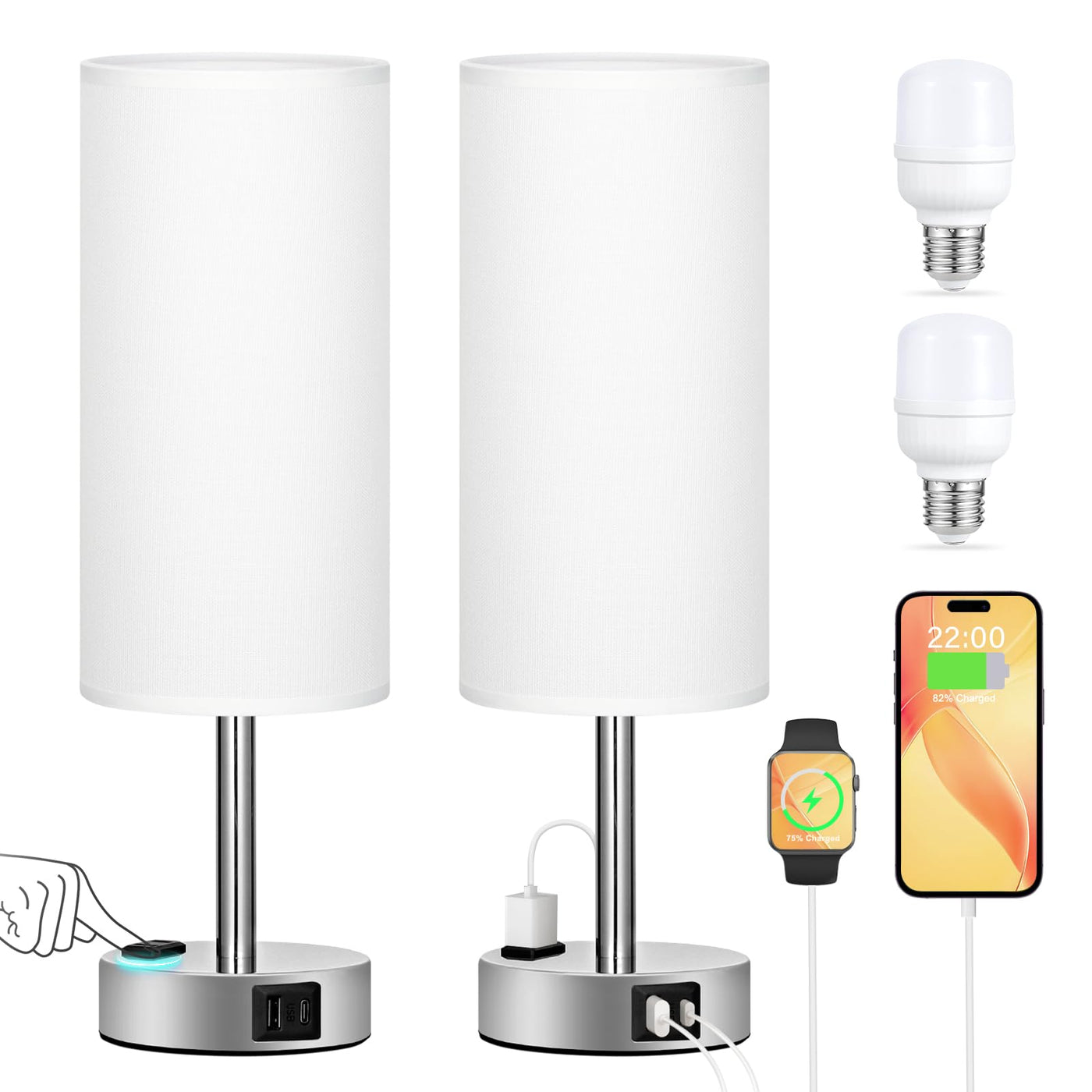 Q: Are the LED bulbs included with the lamps safe for my eyes?A: Yes, the White Touch Nightstand Lamps include 6W non-flicker E26 LED bulbs that provide soft, stable lighting. Unlike traditional bulbs that may flicker and cause eye strain, these bulbs are designed to protect your eyes from discomfort, making them suitable for prolonged use.