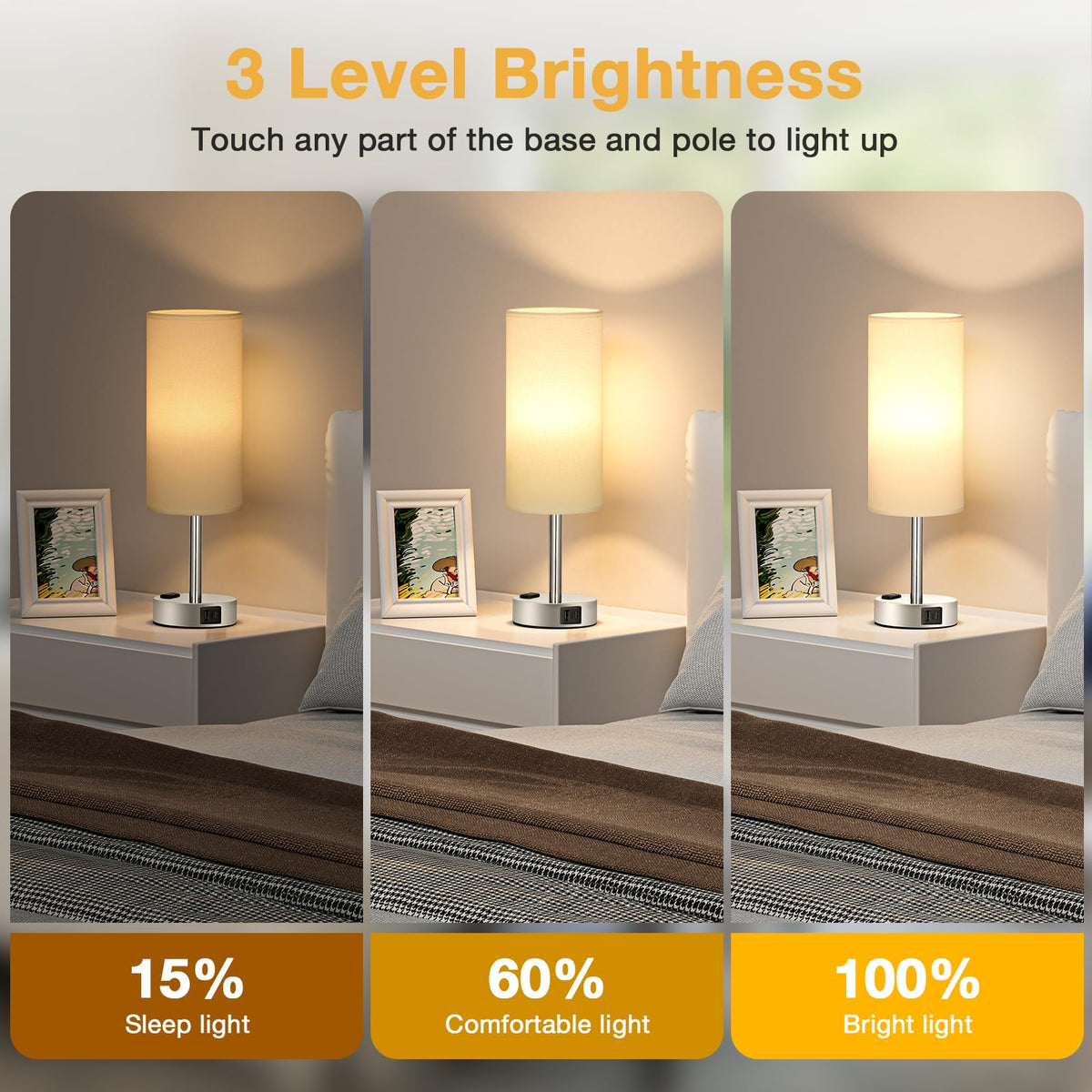 Q: What are the benefits of touch control for bedside lamps?A: The touch control feature allows you to easily adjust the brightness of the White Touch Nightstand Lamps with just a light touch on the base or pole. This is particularly convenient for quick adjustments in low light conditions, enabling you to switch between low, medium, and high brightness levels to suit your needs for reading, relaxing, or working.