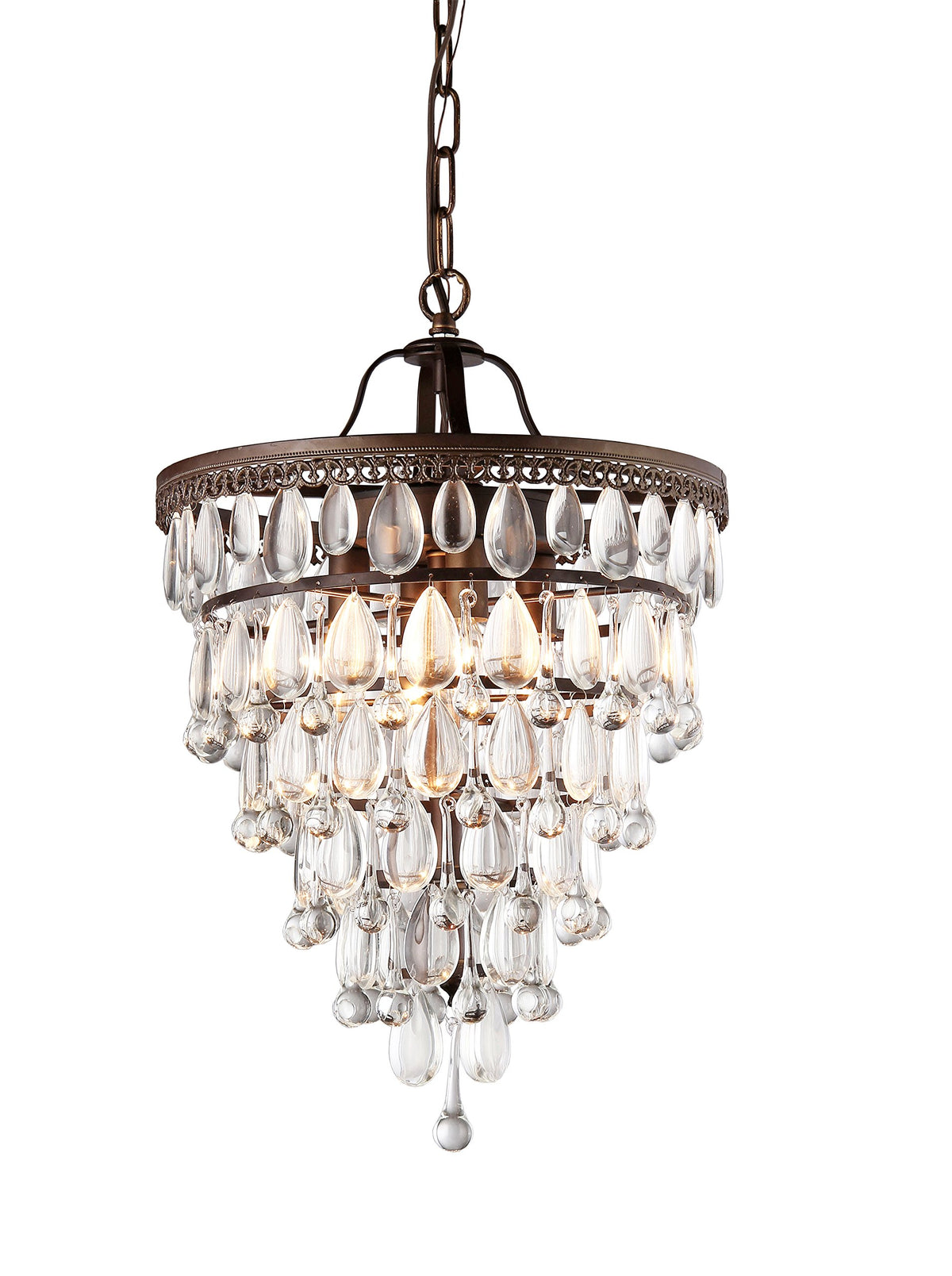 With an elegant antiqued-bronze finish and stunning rows of crystals placed in the shape of an inverted pyramid, this Martinee chandelier shows your taste for elegance and refinement. Four lights brighten up any indoor space. Install this dramatic chandelier in your entryway to create a sophisticated look while giving your family sufficient light as they return from evening activities