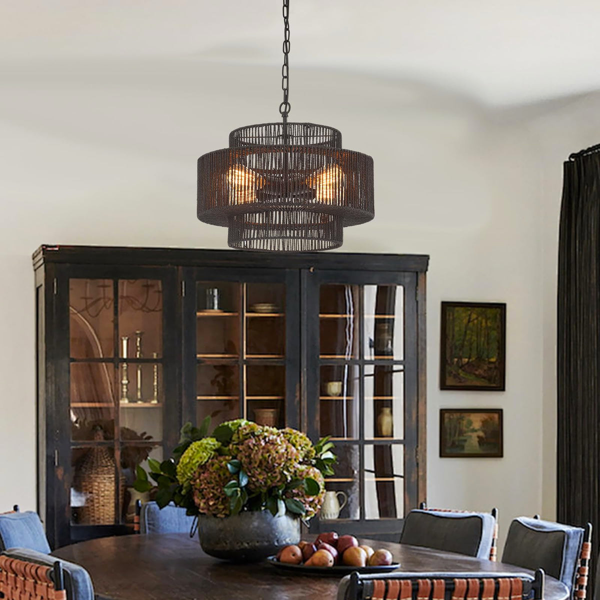Q: What style of decor does this chandelier complement?A: The vintage bohemian style of the Widluth chandelier, with its hand-woven rattan and black metal frames, makes it a perfect fit for farmhouse, boho, or retro decor in dining rooms, kitchens, bedrooms, and living areas.