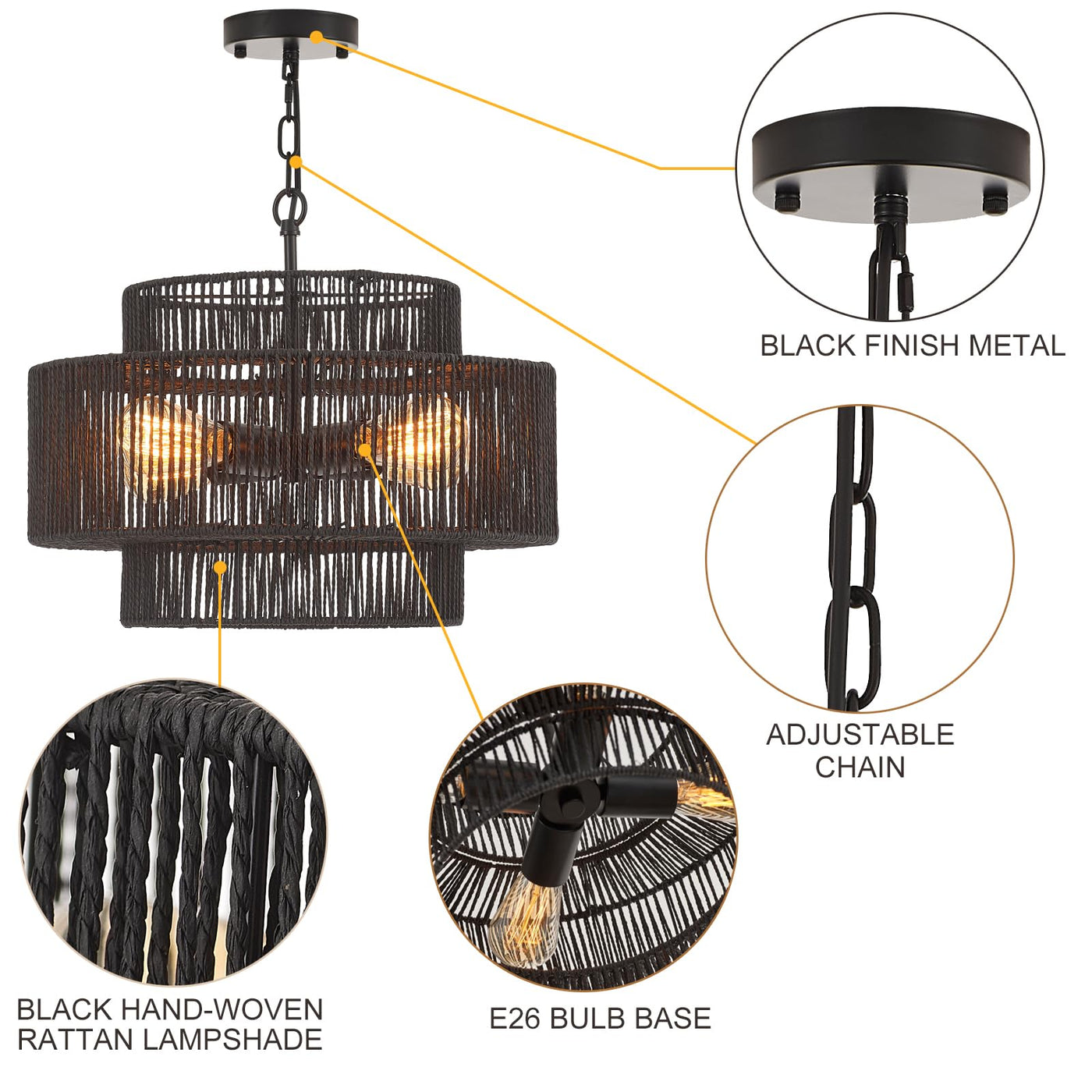 Q: What kind of atmosphere does this chandelier create in a room?A: The hand-woven rattan design of the chandelier allows light to filter through beautifully, casting enchanting shadows and creating a warm, inviting atmosphere in any room.
