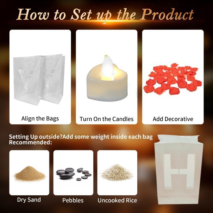 15 Pcs Will You Marry Me? Letter Light-Up Sign: Crafted From well-made Luminous Paper Bags These Letters Are The Centerpiece Of This Romantic Kit. 30 Pcs Led Tea Lights: Provide A Warm And Enchanting Glow Illuminating The Letters And Creating A Magical Atmosphere. 1000 Pcs Red Rose Petals And 1000 Pcs Pink Rose Petals: Add An Extra Touch Of Elegance And Romance To Your Celebration Space. 20 Pcs Latex Balloons And 10 Pcs Aluminum Film Balloons: Enhance The Decorative Effect And Create A Stunning Backdrop For Photos. Setting Up Simply Insert The Led Tea Lights Into The Luminous Will You Marry Me? Letter Light-Up Sign. For Outdoor Use Stabilize The Bags With Rocks Or Sand To Ensure A Safe And Enchanting Display. The Setup Is Incredibly Easy Allowing You To Focus On Enjoying The Celebration With Your Loved One. Decorative Effect When Illuminated By The Tea Light Candles The Luminous Paper Bags Emit A Warm And Enchanting Glow Instantly Transforming Any Space Into A Romantic Paradise. Sprinkle The Red And Pink Rose Petals Around The Area To Add An Extra Layer Of Elegance And Romance Making The Scene Even More Captivating And Memorable. The Latex And Aluminum Film Balloons Can Be Used To Further Enhance The Decorative Effect. Versatile Applications This Romantic Kit Is Perfect For Various Celebrations Whether ItS A Surprise Proposal A Romantic Anniversary Dinner Or A Grand Celebration Of Love. Its Versatile Design Makes It Suitable For Different Venues From Your Living Room And Hotel To The Waterfront Or Bedroom. Use These Will You Marry Me? Lights To Infuse Any Setting With Romance And Sophistication. Perfect Gift This Will You Marry Me? Light-Up Letters Set Is An Ideal Gift For Your Loved One On Their Special Day. With Its Easy Setup And Enchanting Glow ItS Sure To Make Your Loved One Feel Truly Cherished And Remembered Creating Unforgettable Moments That Will Be Treasured Forever.