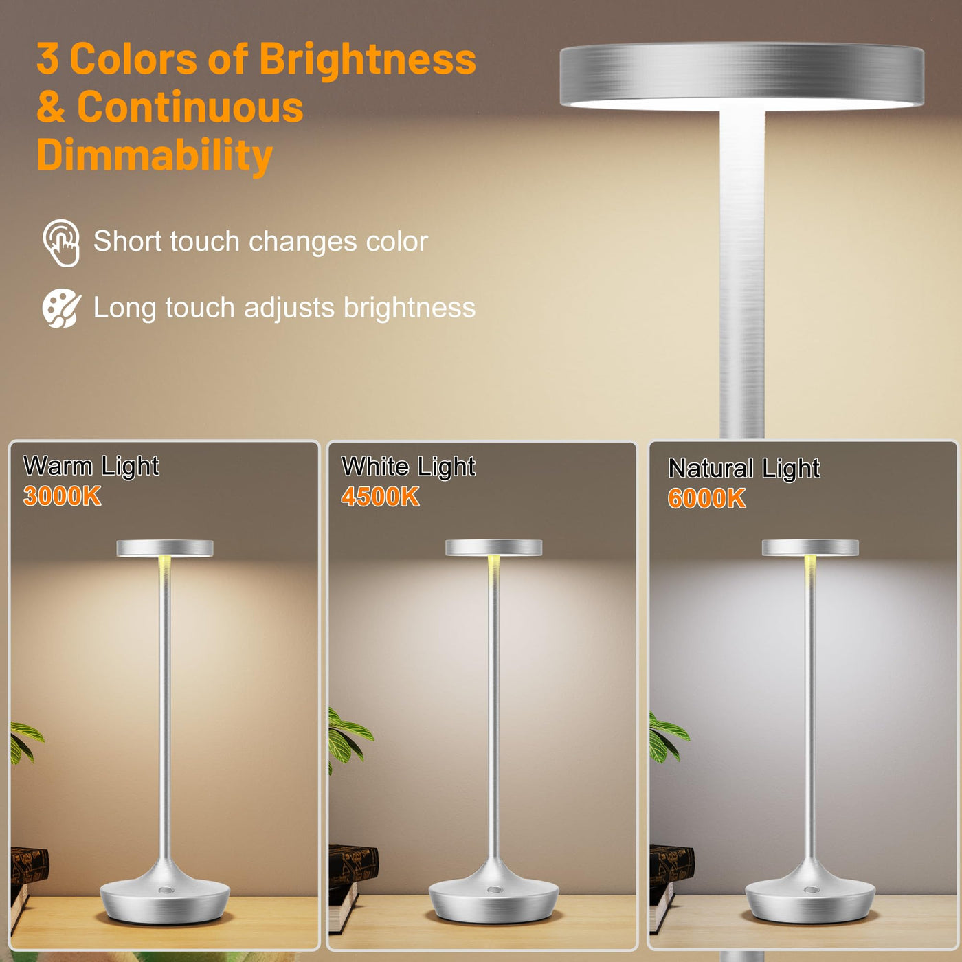 Q: What are the lighting options available for the Willdoak Cordless Table Lamp?A: The Willdoak Cordless Table Lamp features a touch dimmable light with three adjustable color settings: natural, warm, and white. You can also long-press to adjust the brightness from 100% to 10% for customized lighting.