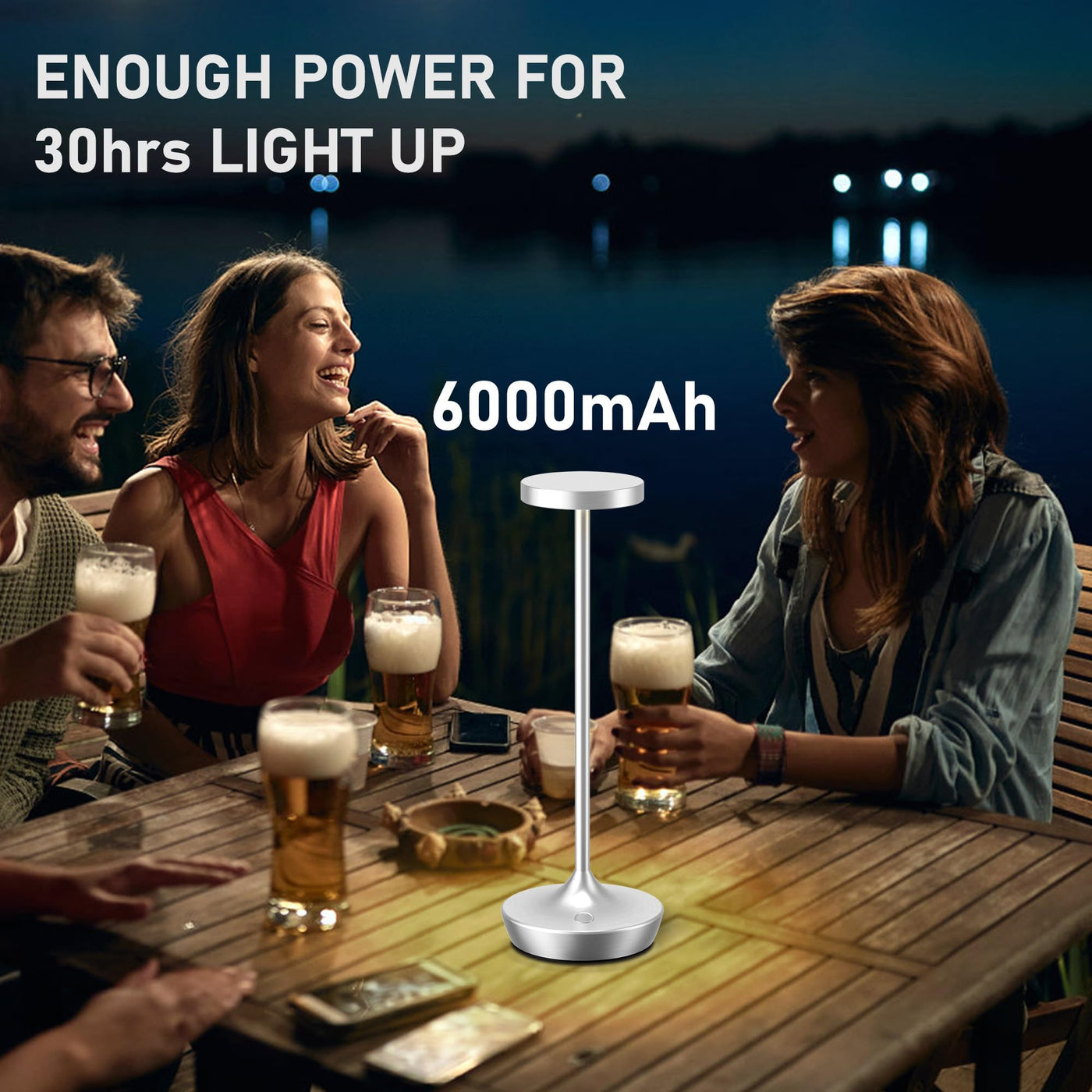 Q: How long does the battery last on a full charge?A: The rechargeable 6000mAh battery of the table lamp can provide 12 to 60 hours of use on a full charge, depending on the brightness setting you select. It takes approximately 4 to 6 hours to fully recharge.