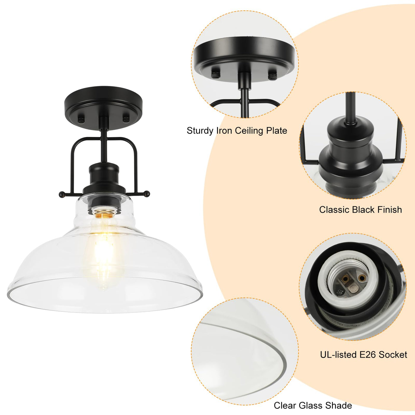 Q: What type of bulbs can I use with the WILON 2 Pack Semi Flush Mount Ceiling Light?A: The WILON Semi Flush Mount Ceiling Light features an E26 bulb base, allowing compatibility with a wide range of bulbs including incandescent, halogen, LED, CFL, and energy-saving bulbs. You can also use dimmable bulbs along with a dimmer switch to create the perfect lighting atmosphere.