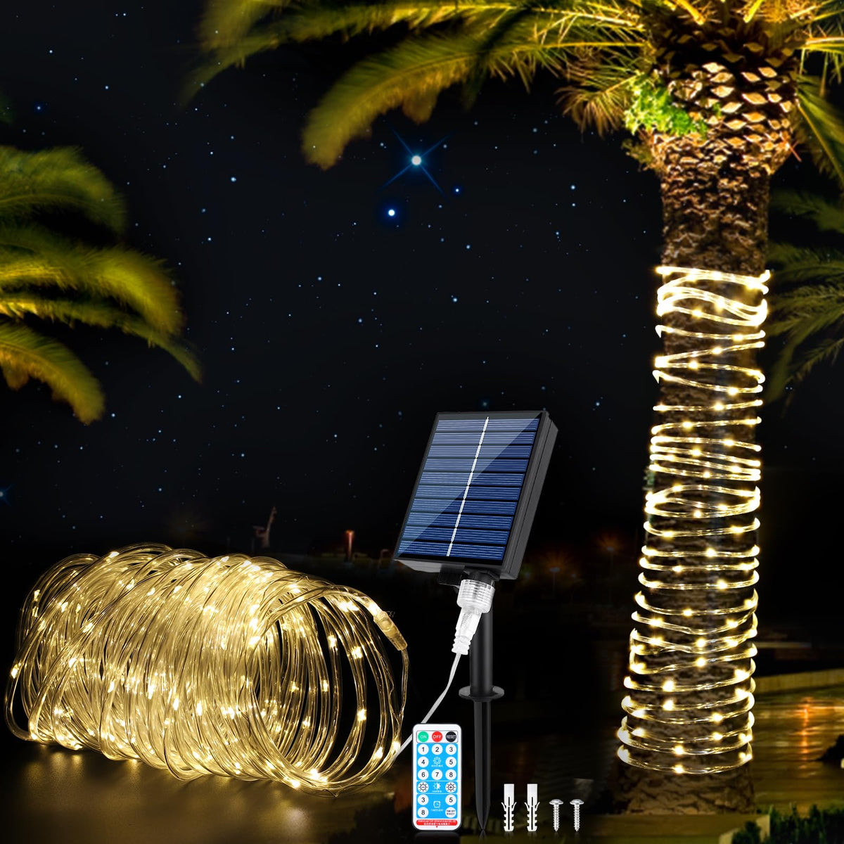 WIND STAR Solar Rope Lights Outdoor Warm White, 72FT 200 LED Solar Powered Rope String Lights with Remote Control, 8 Modes IP67 Waterproof Solar Rope Tube Light Decorative for Yard Garden Fence Tree Party Camping Wedding Features of Solar LED Rope Light: 8 light modes: combination, fireflies flashing, waves, fading, chasing/flashing, fading slowly, twinkle/flashing and steady on. Memory & timer function: Just set one time, it will stay the set until you adjust it again. Timer function: 3H/5H/8H. Brightness adjustable function: 100%-75%-50%-25%. Specification: Light Color: Warm White LED Quantity: 200 LED Total Length: 72ft Rechargeable Battery: 3.7V 1200mAh Solar Panel: 5V 240mAh Charging Time: about 6-8 hours Working Time: about 8-12 hours(after fully charged) Installation ways: insert into ground or wall mounted Widely Application: The solar fairy rope light is perfect for outdoor decoration, special events decoration and festival decoration: courtyard, terrace, roof, garden, fence, deck, path, street, tent, trampoline, tree, party, wedding, birthday, Valentine's Day, Halloween, Thanksgiving Day, Christmas, etc.
