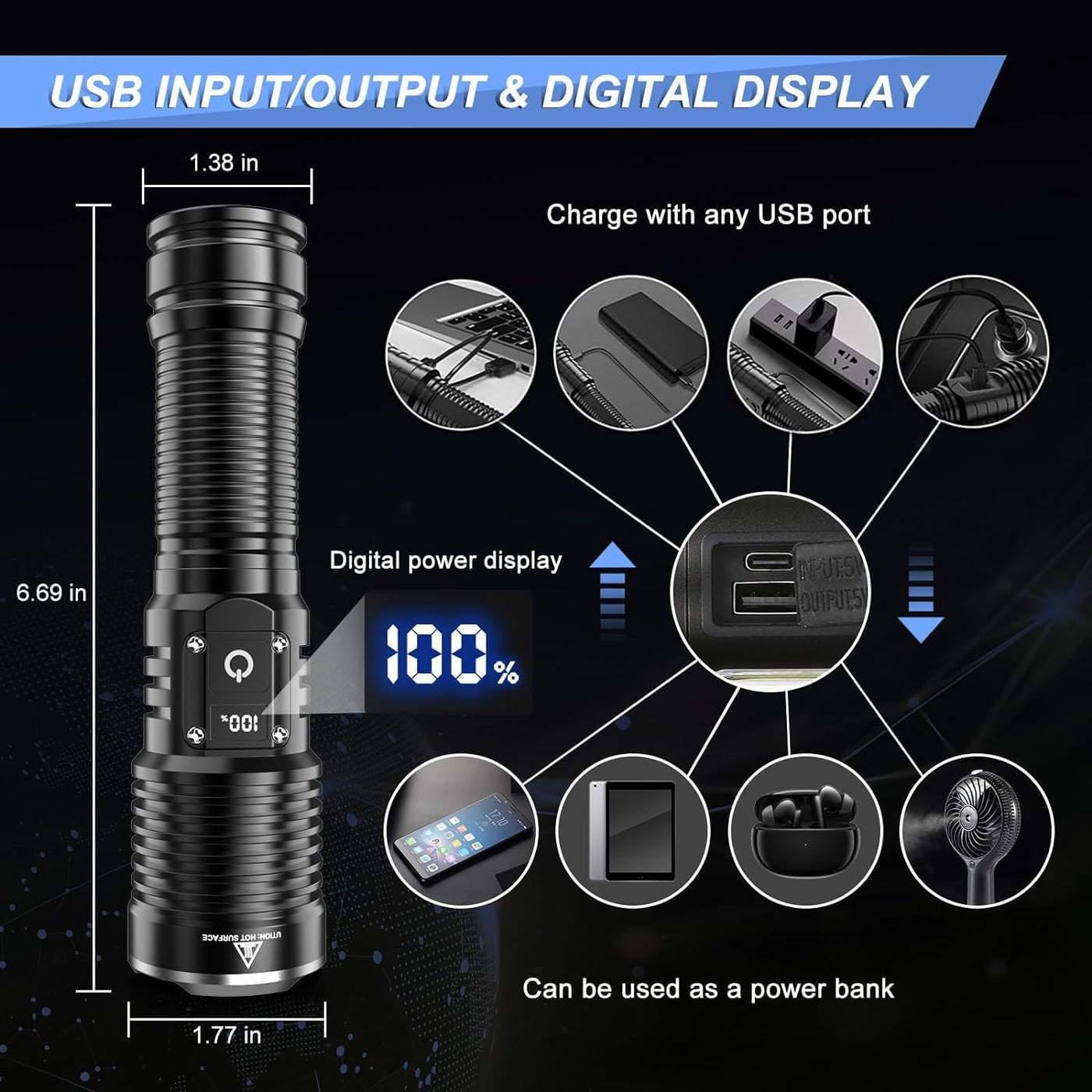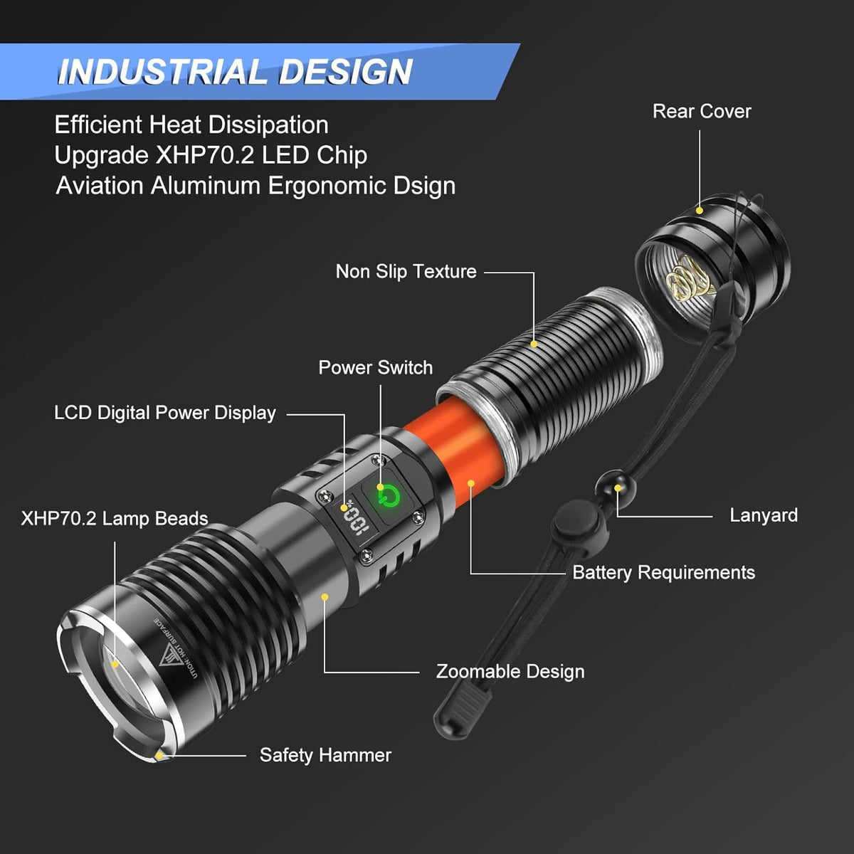 For times when your power goes out unexpectedly, an emergency repair arises after sundown, or a project has you working in hard-to-see spaces,a reliable and readily available led rechargeable flashlights is a must-have.Gone are the days of searching high and low for batteries.The flashlights high lumen rechargeable has longer-lasting life and use powerful LED bulbs.Theyre sleeker too,and often made of waterproof and drop-resistant materials.In other words,it is a genuine torches for emergencies. Overview of this rechargeable torch: Super bright: XHP70.2 LED,brightness can be up to 2000 lumens. USB Rechargeable: Built-in USB C interface,fast charging speed. Long Life: can provide 4-12 hours work time. Metal Body: durable,waterproof,Shockproof. Zoomable: Adjust the beam between spotlight and floodlight. 5 Modes for different situation:High-Middle-Low-Strobe-SOS. Power Indicator: Digital display. Specifications Blub Type: Upgrade XHP70.2 LED Torch Body Material: Aluminum Alloy Water Resistant: IPX4 Waterproof Brightness: 900000 Lumens, White beam Brightness Dimming Modes: Full, Medium, Low, Quick Strobe, SOS Product size :17*4.5*3.5CM Net weight:208G Package Contents 1*XHP70 LED Flashlight 1* Rechargeable Battery 1*Type-C Cable 1*Lanyard 1*Torch User Manual 1* Tube 1* AAA Holder 1*Gift Box WARM TIPS: ?Please remove the plastic wrap off the batteries at first time use, otherwise it cant connect well to recharge. ?The positive pole of the flashlight faces inward and the negative pole faces outward.Please confirm the positive and negative poles before use. ?Getting hot is normal because of high lumen output.we recommend that you can choose medium/low mode for long time ues. ?When using the flashlights,make sure that the screw thread is not loose,otherwise it may cause no light or weak light.