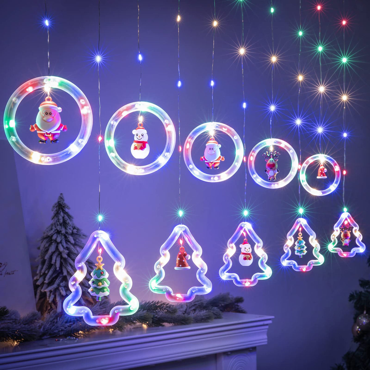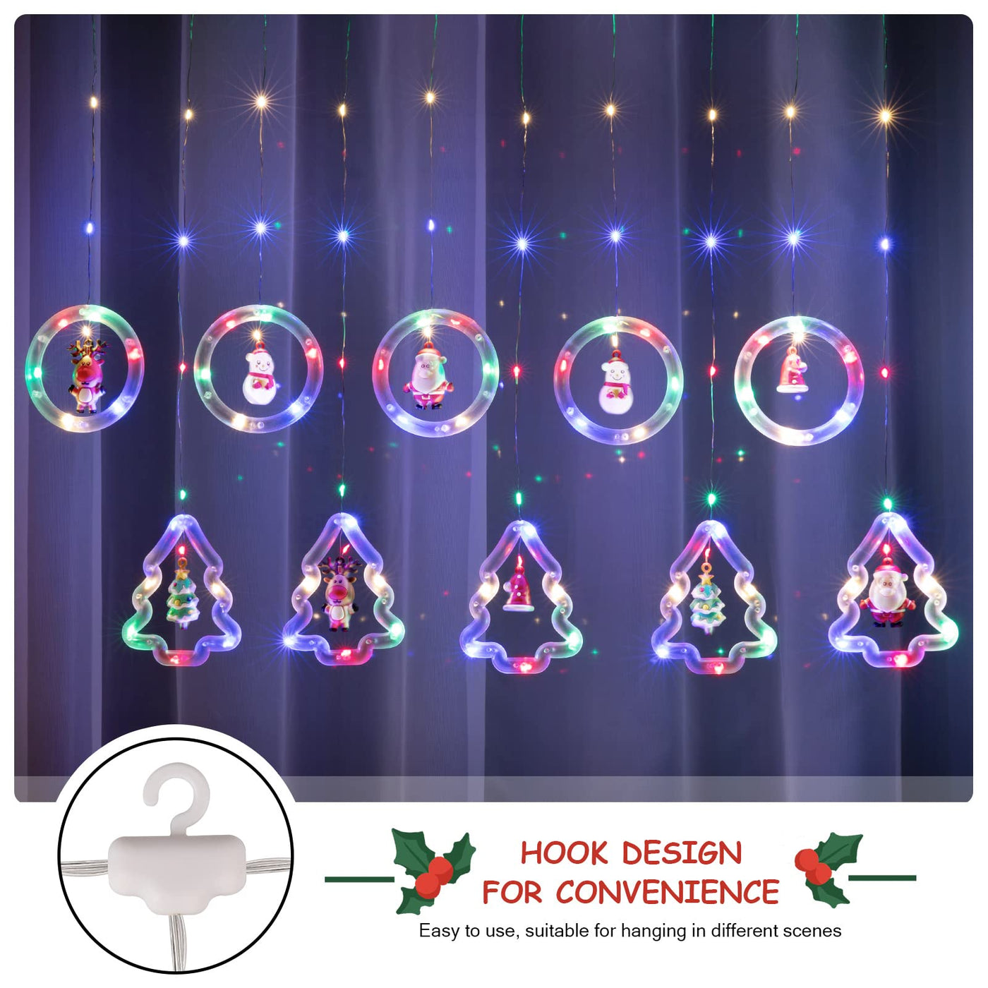 BLOOMWIN LED Christmas Curtain Lights for Window - Size : 9.8ft x 3.3ft - Unique design lighted tree and circle ring: 10 PCS - Color: warm white, cold white and multi-colored for option - USB powered - Remote control - 8 different modes