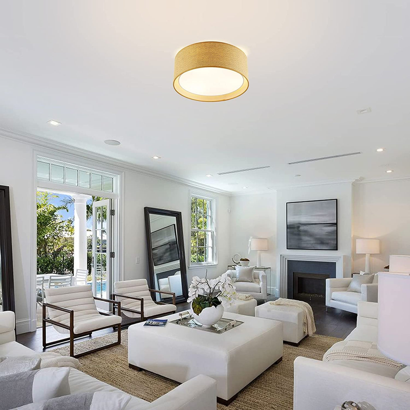 Q: What materials are used in the construction of the WINGBO ceiling light?A: The fixture is made from a metal frame combined with a fabric and acrylic double drum shade, providing both durability and an elegant appearance.