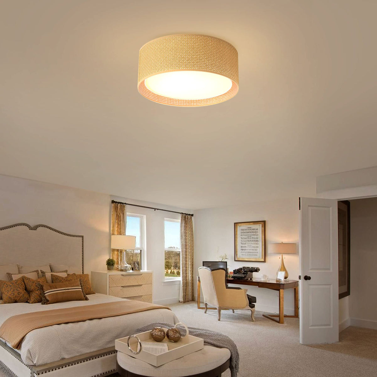 This ceiling light features a combination of metal and a stylish fabric and acrylic double drum shade, creating a sophisticated look that complements contemporary decor. The round canopy ensures a secure and stable installation, while the soft light emitted by the acrylic shade helps to create a warm and inviting atmosphere. This fixture is designed to provide bright illumination without the harsh glare associated with traditional lighting, making it an excellent choice for any room in your home.