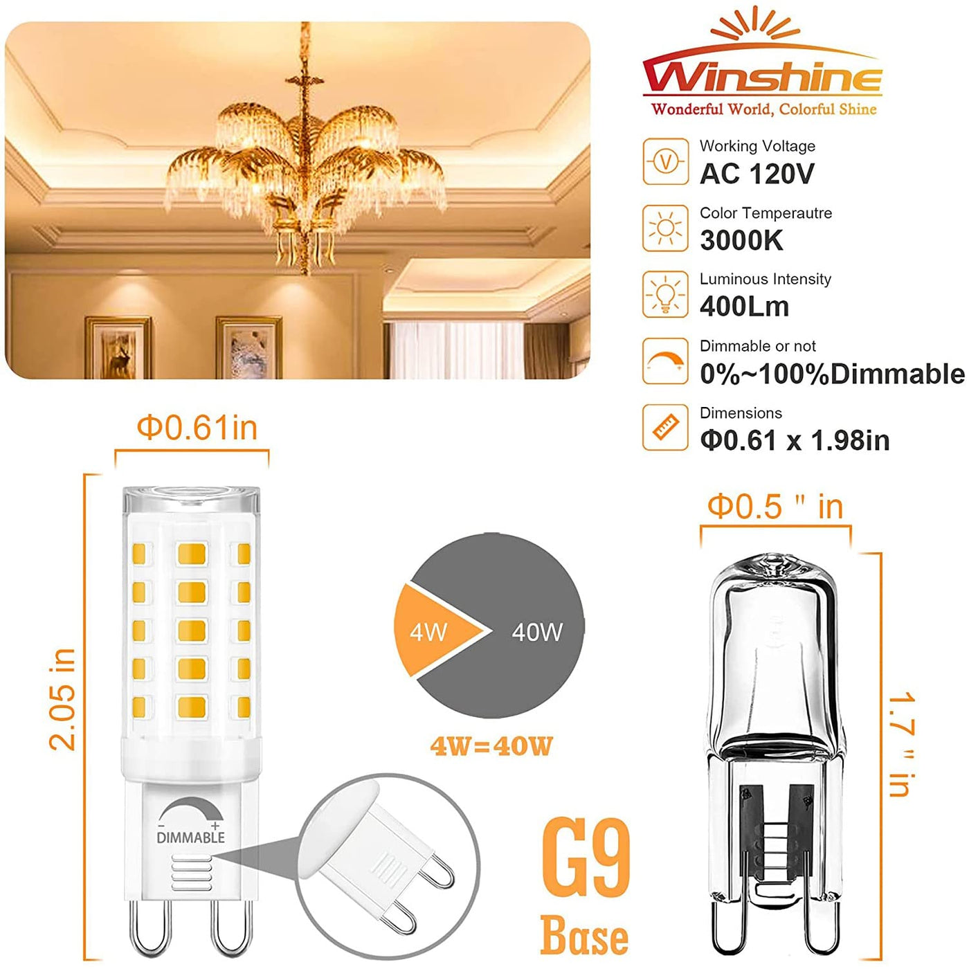 Q: Are the Winshine G9 LED bulbs compatible with all dimmer switches?A: Yes, the Winshine G9 LED bulbs are fully dimmable and compatible with most dimmer switches, including popular brands like LUTRON, LEVITON, and LEGRAND. This allows you to adjust the brightness from 0% to 100% without flickering.