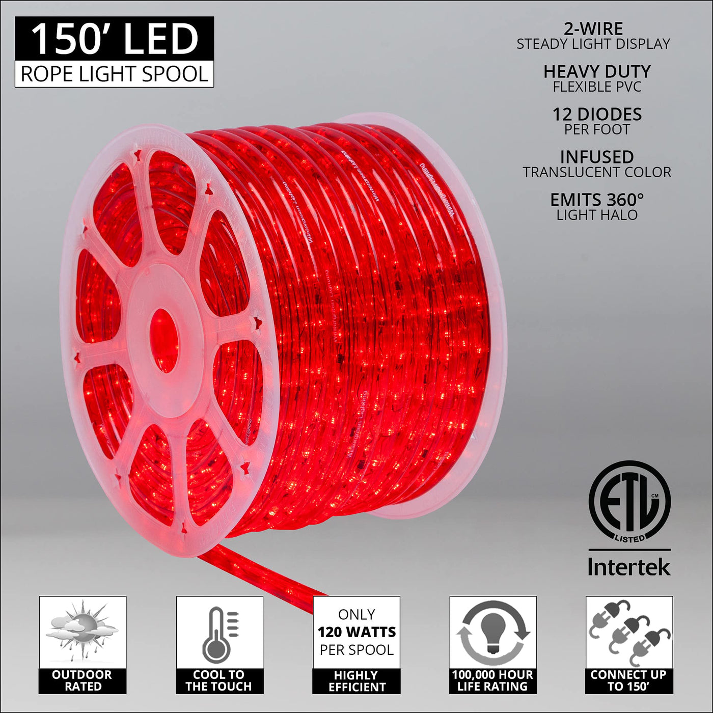 Wintergreen Lighting 150ft 1800 LED Commercial Grade Red Rope Light Kit, LED Flexible Light Rope String Light Outdoor - LED Ligh