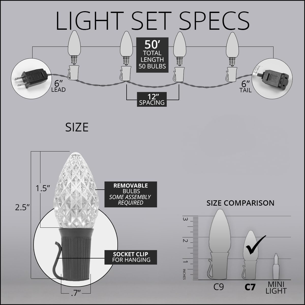 C7 Warm White Non-Twinkle LED Lights: Includes 50 warm white OptiCore C7 steady LED bulbs on a 50-foot green stringer with sockets spaced 12 inches apart.
