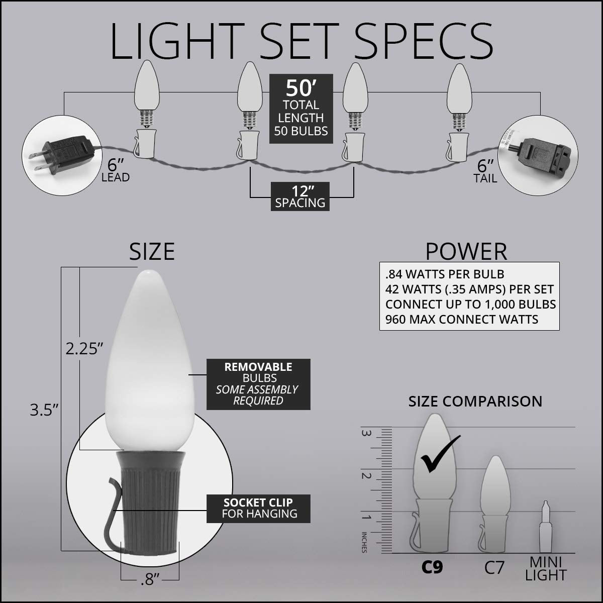 Q: What are the dimensions of the C9 OptiCore Christmas lights?A: The C9 OptiCore Christmas lights come with fifty bulbs and a total length of fifty feet, with bulbs spaced twelve inches apart.