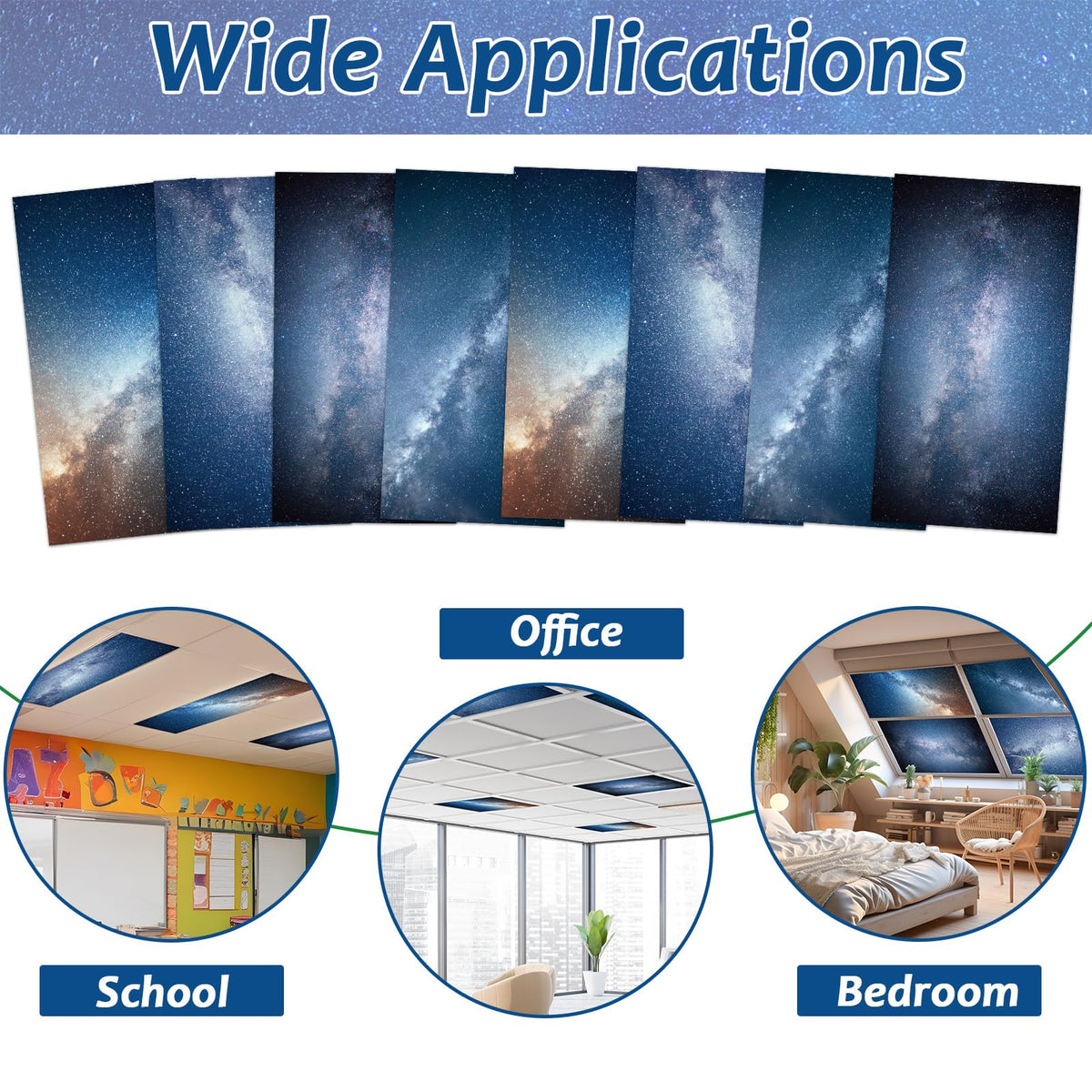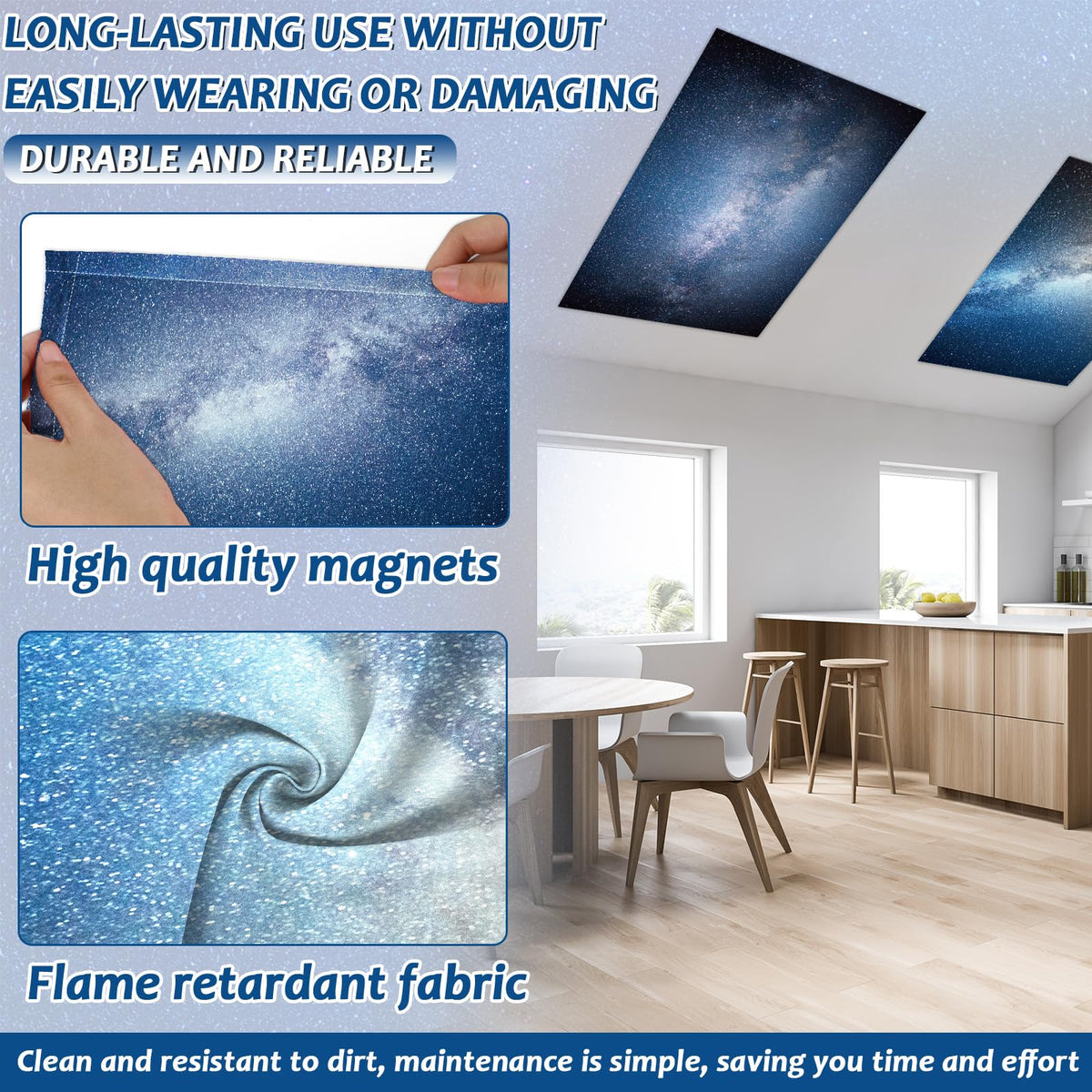 Constructed from well-made polyester fabric, these light covers feature a captivating galaxy pattern that not only enhances aesthetics but also helps to alleviate distracting flicker and glare. Each cover measures approximately 2 x 4 feet, making it compatible with most standard fluorescent light fixtures. The innovative magnetic design allows for easy installation without the need for tools; simply attach the covers using the included magnetic stickers. The movable magnets enable you to adjust the position as needed, ensuring a perfect fit for your lighting setup.