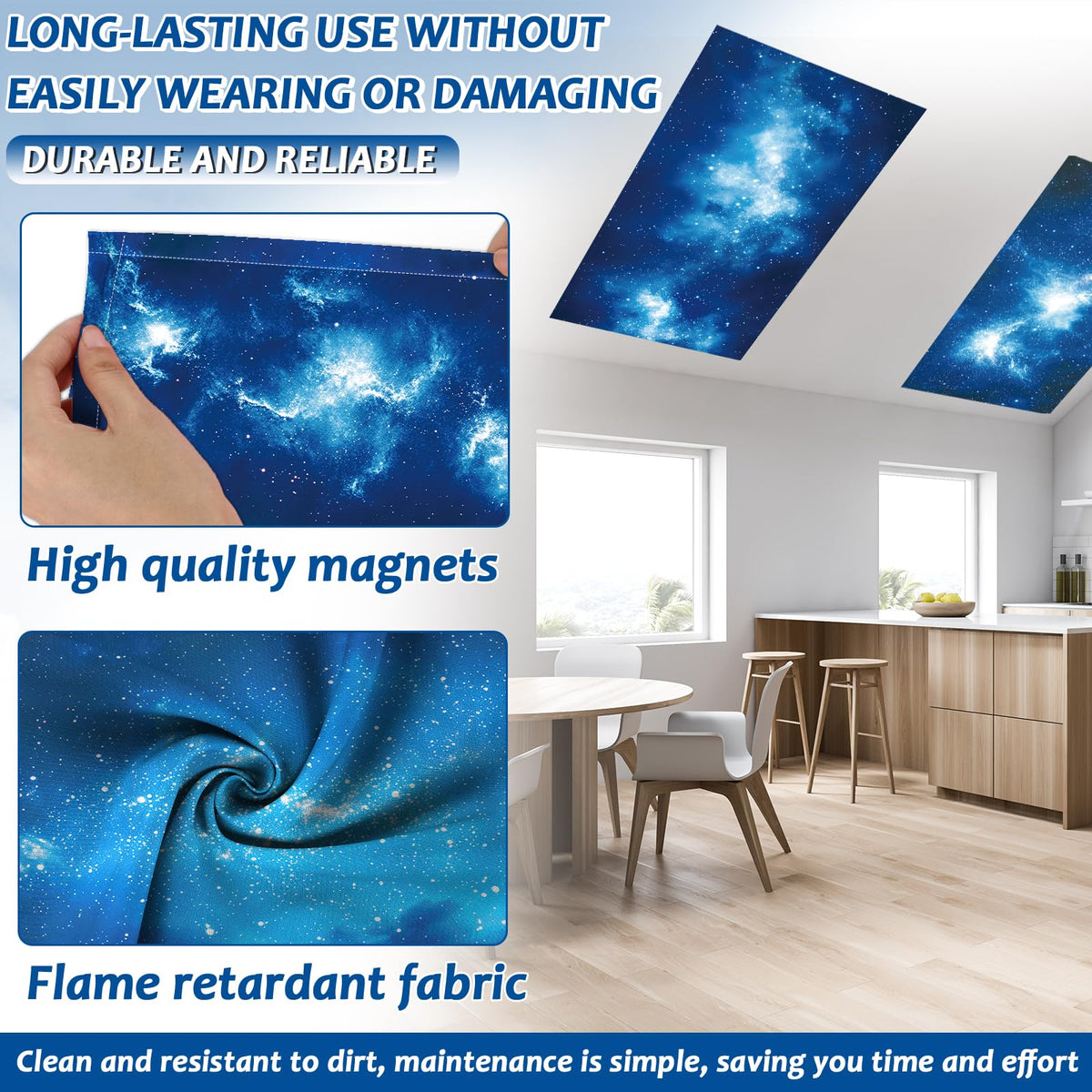 Crafted from well-made polyester fabric, these light covers feature a beautiful blue starry sky pattern that not only adds an aesthetic touch but also serves a practical purpose. Each cover is designed with 10 adjustable magnets for easy installation, allowing you to attach them to your ceiling lights without the need for tools. The movable magnets enable you to customize the position for optimal placement, ensuring a perfect fit for most standard fluorescent light fixtures.