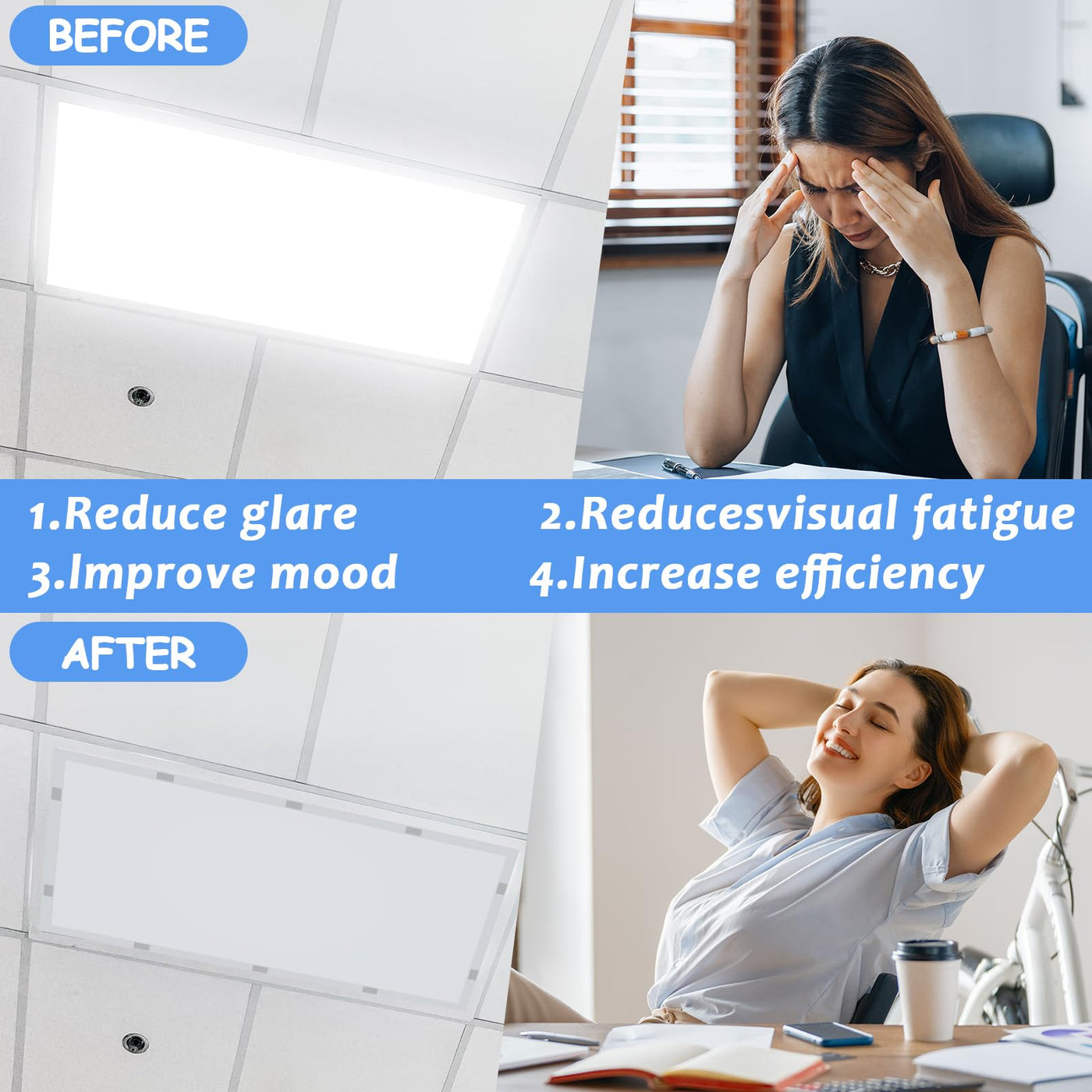 Q: Do the light covers help with headaches caused by bright lights?A: Yes, these light covers are designed to reduce glare and flicker from fluorescent lights, which can help alleviate headaches and create a more relaxing atmosphere.