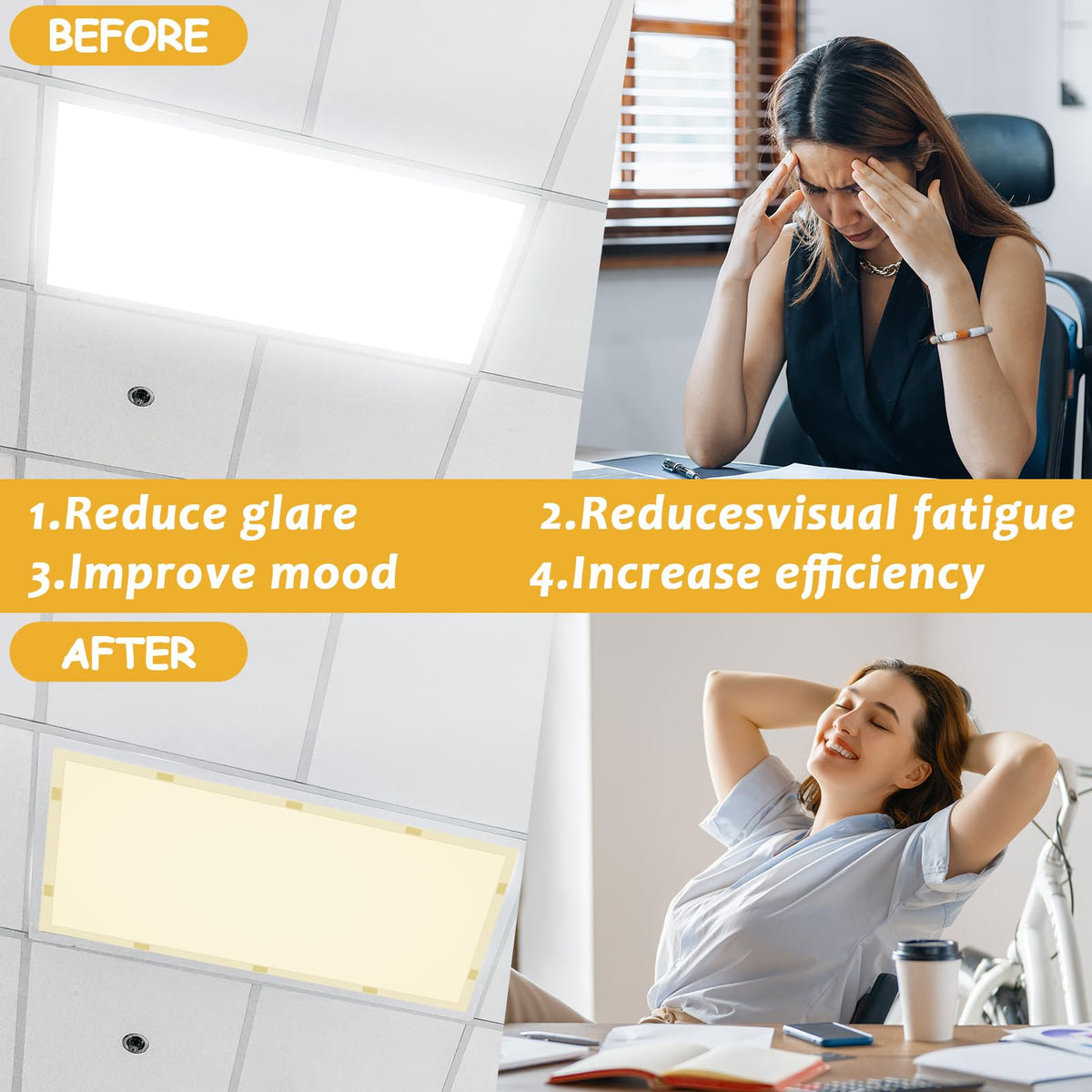 Q: Can these light filters help reduce headaches caused by bright lights?A: Yes, the Wiooffen light filters are designed to reduce glare and flicker from fluorescent lights, which can contribute to headaches and discomfort, creating a more comfortable environment.