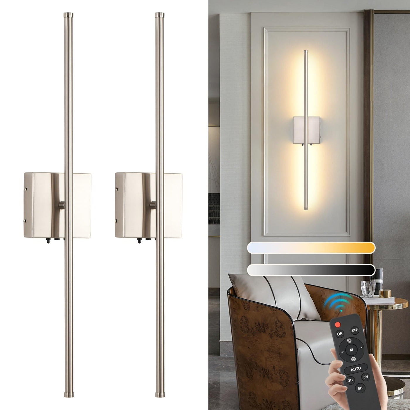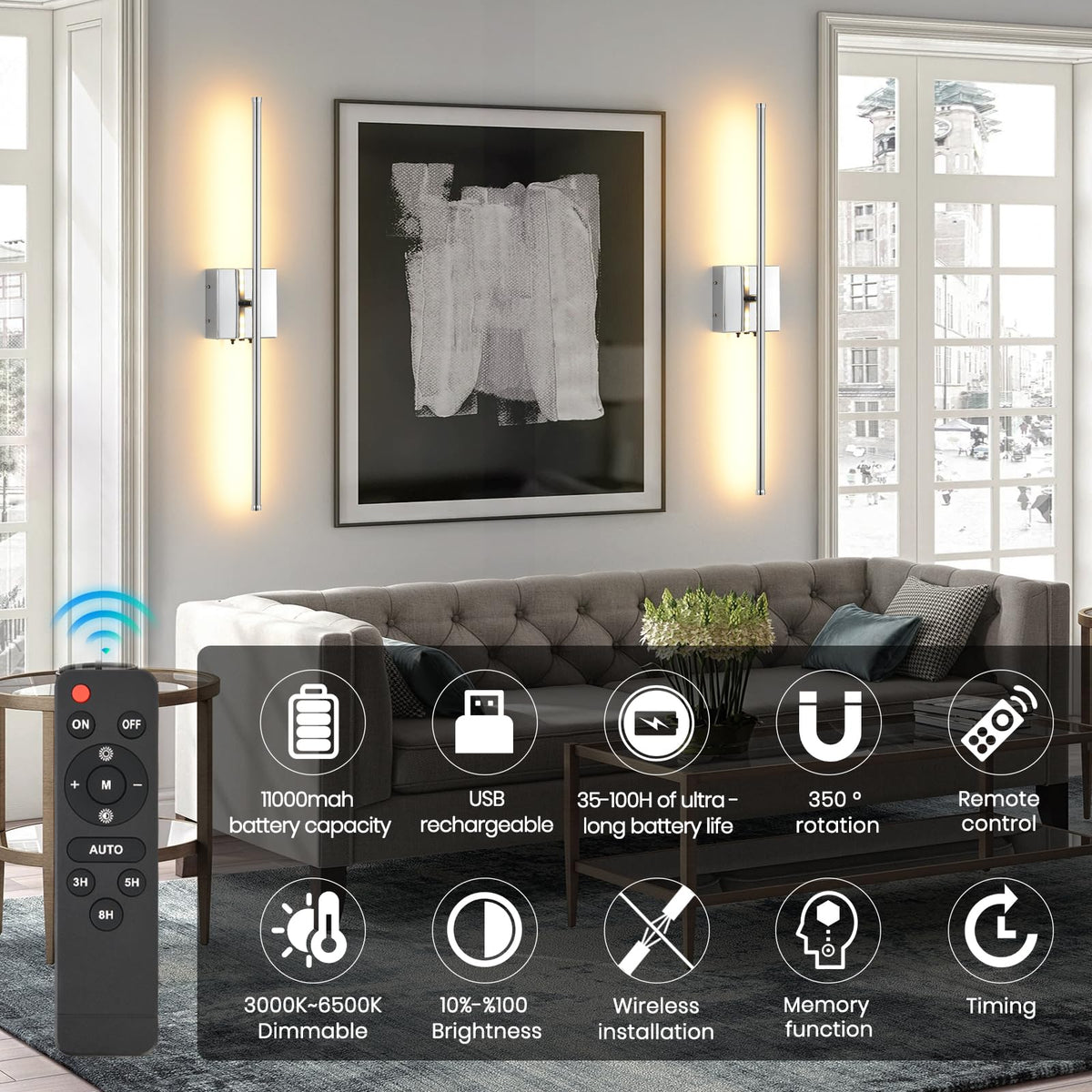 Battery LED Wall Sconce, offering 10 brightness levels (10%-100%), color temperature options (3000K, 4500K, 6500K), wall sconce features timer functions (3h, 5h and 8h), a 32-foot remote control range, and a built-in 2 chargers with charging indicator for fast charging Full charge in approx. 8-9 hours. Rechargeable wall lights equipped with two built-in batteries totaling 5200mAh, it ensures over 30 hours of continuous use at maximum brightness and an impressive 70+ hours at the lowest brightness.