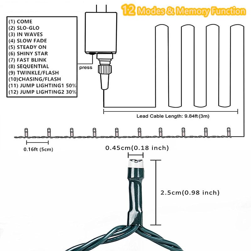 Features: 8 Light Effect: 1.Combination 2. In wave 3. Sequential 4. Slo Glo 5. Chasing/Flash 6. Slow fade 7. Twinkle/Flash 8. Steady on Different lighting effects are controlled by only one button.