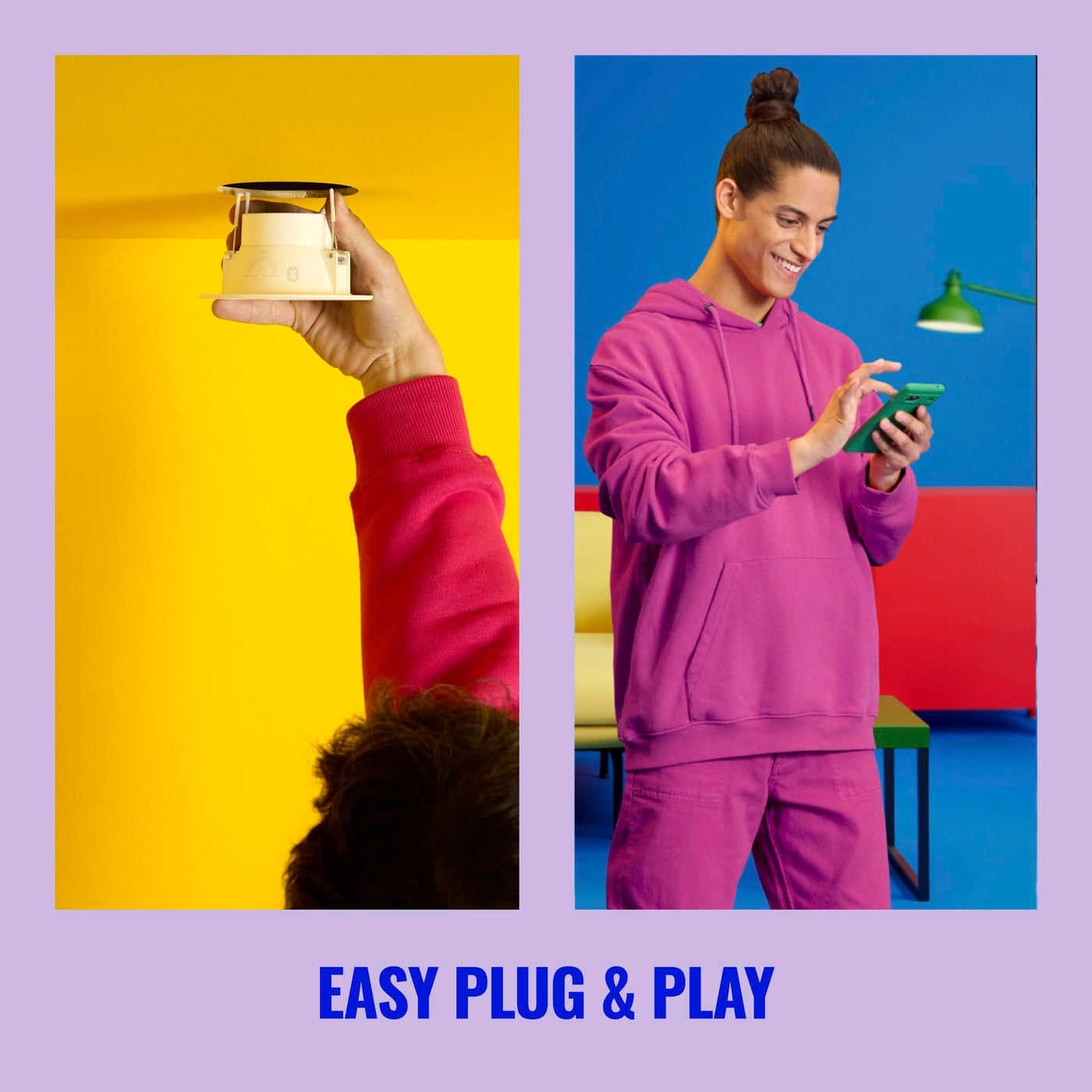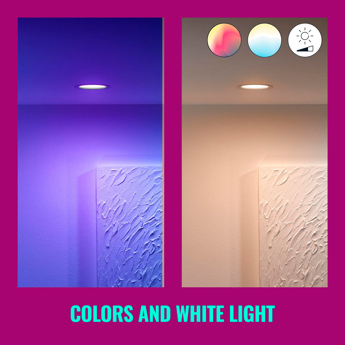 The WiZ LED full color downlight brings smart lighting for your daily living. Fit into your ceiling to create the ambience of your choice with 16 million colors as well as warm to cool white light. You can set schedule to turn lights on and off according to daily or weekly routines control with your smartphone or your voice and have remote access to your lights even when you're away. WiZ lights connect to your existing Wi-Fi, no additional hardware is needed.