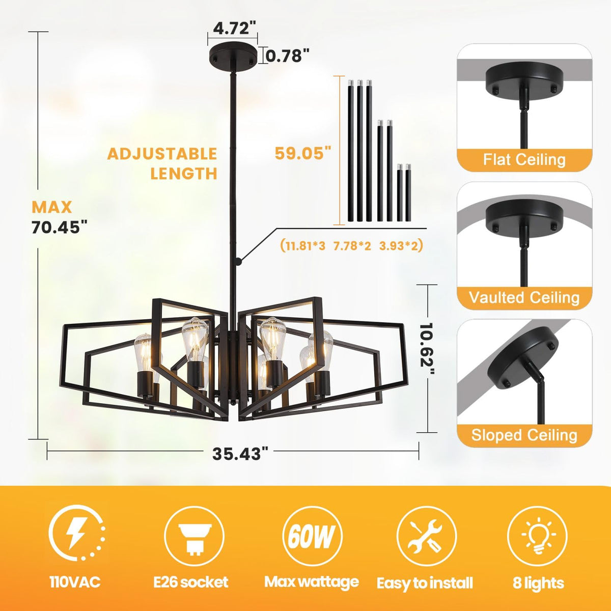Wjshome Black Chandelier, 8-Light Farmhouse Dining Room Light Fixture, Geometric Pendant Lights Kitchen Island, Modern Industria