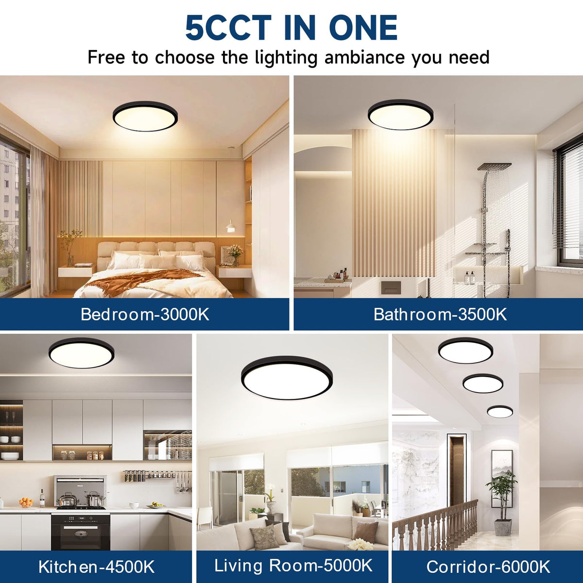 Q: What are the different color temperature options available for the WKONCLDY LED Ceiling Light?A: The WKONCLDY LED Ceiling Light offers five color temperature settings: 3000K (warm white), 3500K (neutral white), 4500K (cool white), 5000K (daylight), and 6000K (bright daylight). You can easily switch between these options by toggling the button located at the back of the fixture.