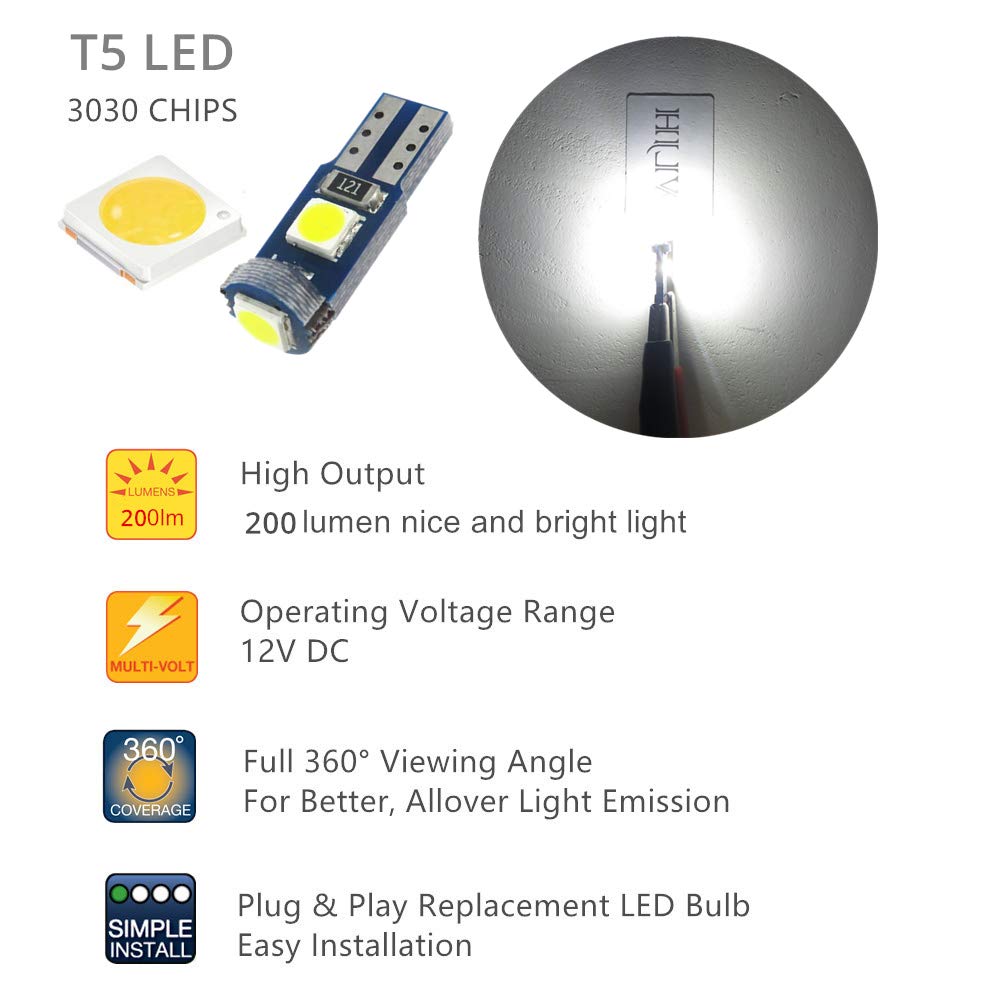 Q: What types of vehicles are compatible with the WLJH T5 LED bulbs?A: The WLJH T5 LED bulbs are designed to be compatible with a variety of vehicles that use T5 wedge type bulbs, including models that require bulbs for interior dome lights, map lights, gauge clusters, and dashboard indicators. They are suitable replacements for T5 bulb types such as 17, 18, 27, 37, 58, 70, 73, 74, 79, 85, 86, and 2721.
