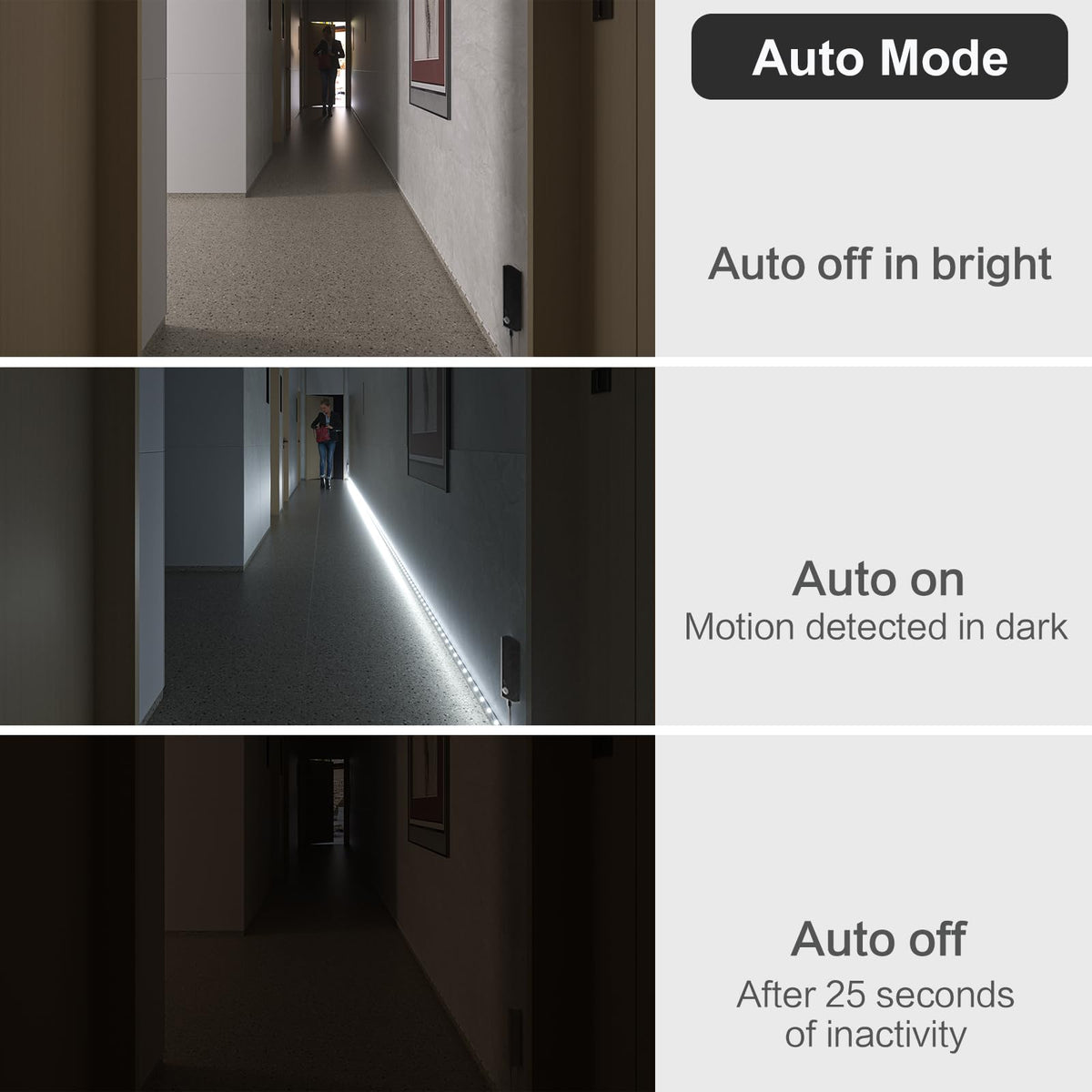 Q: How does the motion sensor work on the WOBANE LED Closet Light?A: The WOBANE LED Closet Light features a built-in motion sensor that activates the light automatically when it detects human movement within a 10-foot range in low-light conditions. It will turn off after 20 seconds of no movement or if placed in a bright environment.