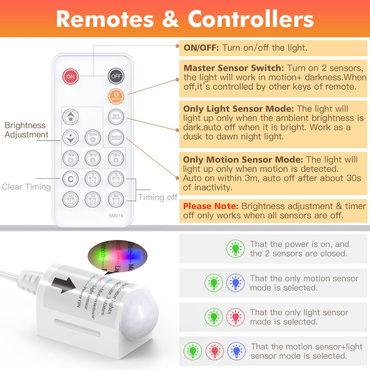 Q: How does the motion sensor work on the WOBANE LED Strip Lights?A: The motion sensor on the WOBANE LED Strip Lights detects movement within a range of 10 feet. It has two modes: day mode, which activates in any light condition, and night mode, which only triggers in darkness. This feature ensures the lights automatically turn on when motion is detected and turn off after a period of inactivity.