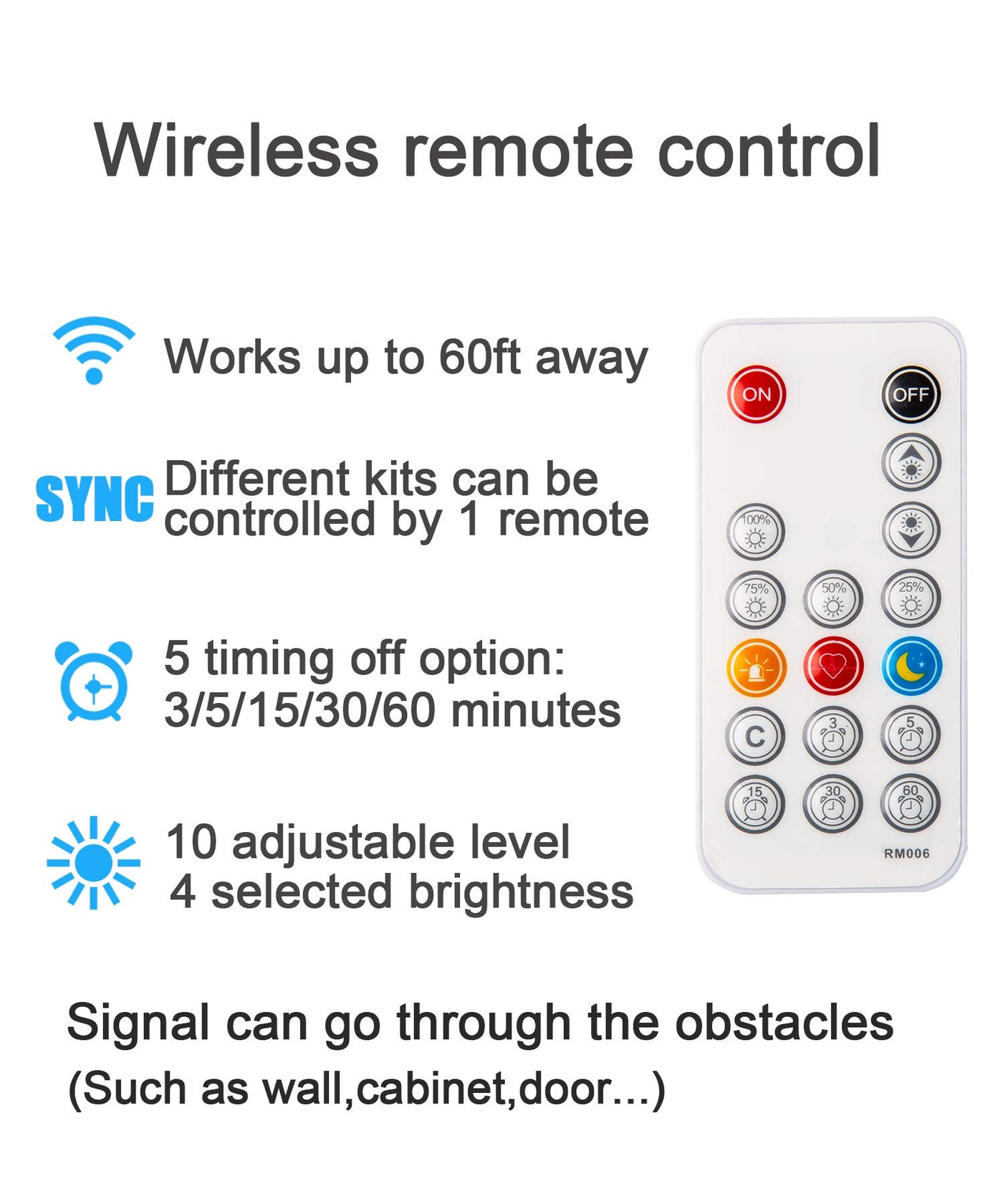 Q: Does the RF remote control have any special features?A: The 17-key RF remote control includes timing off, dimming options, hot buttons, rematch functions, and a dynamic feature with a control distance of up to 60 feet.
