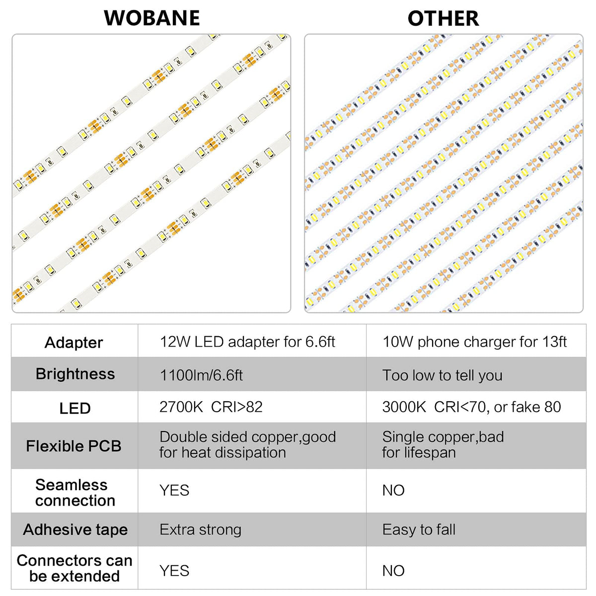Q: What is the color temperature of the WOBANE LED strip lights?A: The LED strip lights emit a warm white light with a color temperature of 2700K, which creates a cozy and inviting atmosphere in your kitchen or workspace.