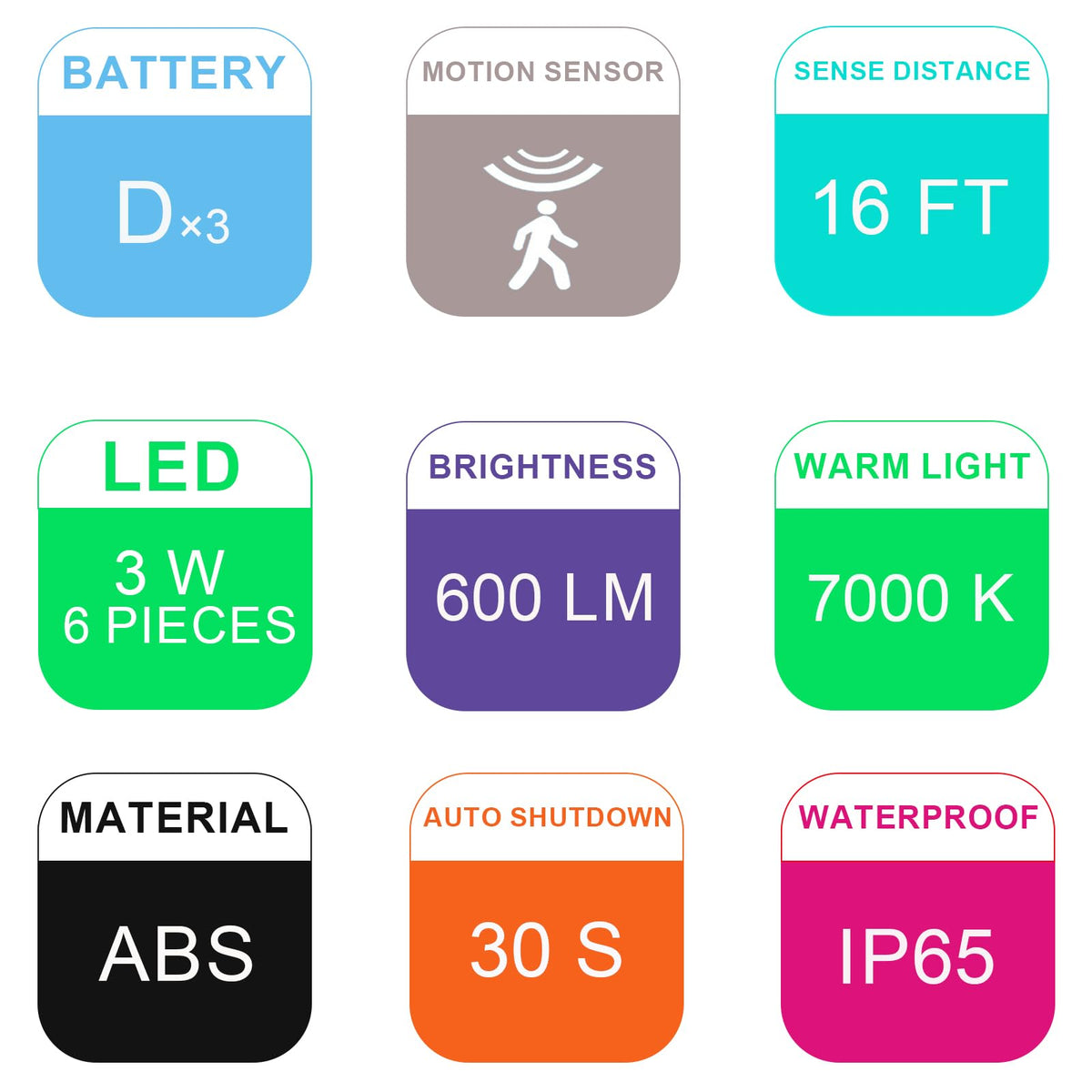 Q: How does the motion sensing feature work?A: The motion sensor detects movement within a range of up to 5 meters (16.4 feet) and remains illuminated for 30 seconds after detecting motion.