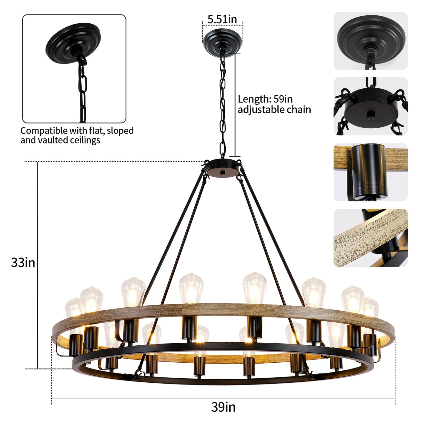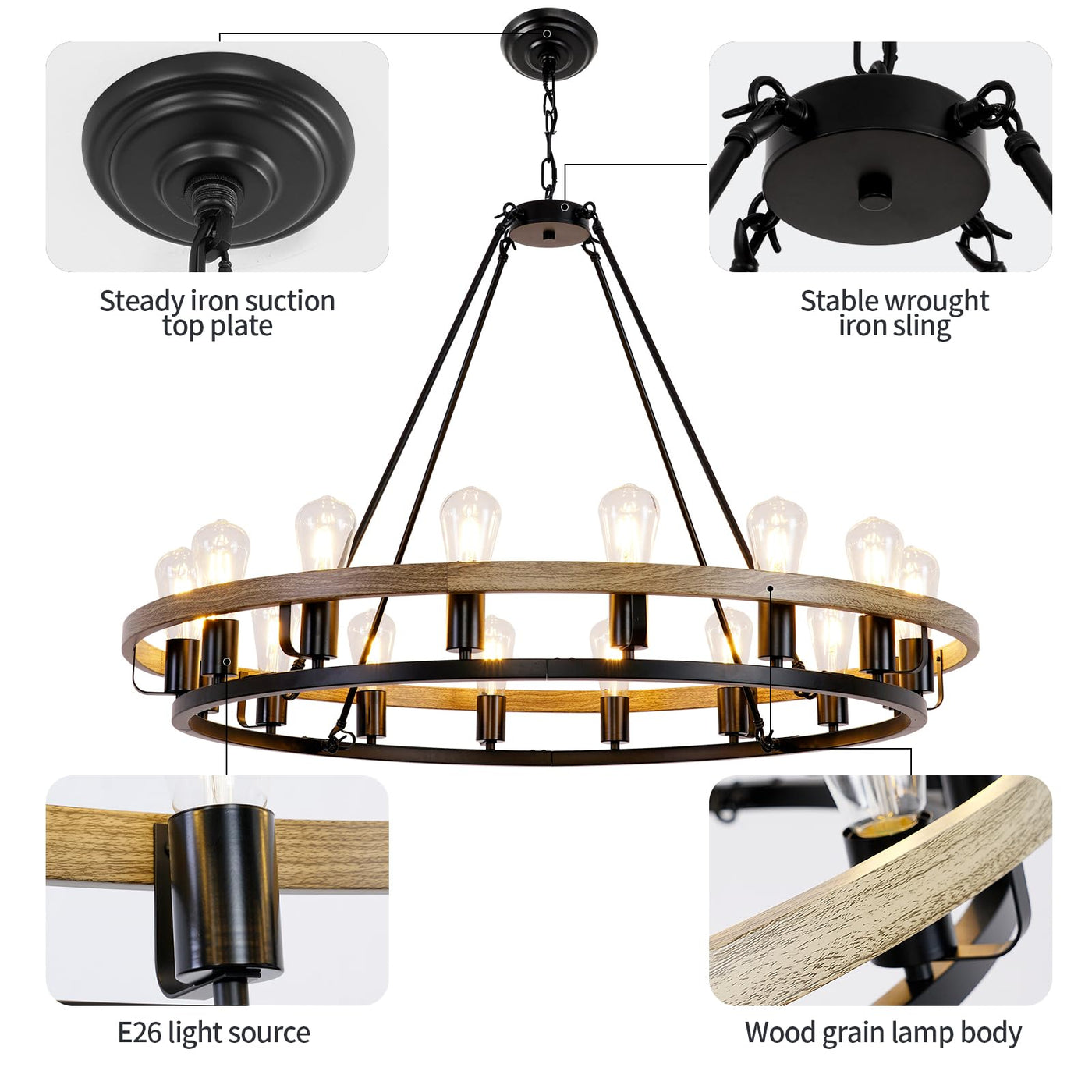 Wagon Wheel Chandelier 39-Inch 16-Light, Oak Wood And Black Finish Round Rustic Farmhouse Chandelier Extra Large For High Ceilings, Living Room Foyer
