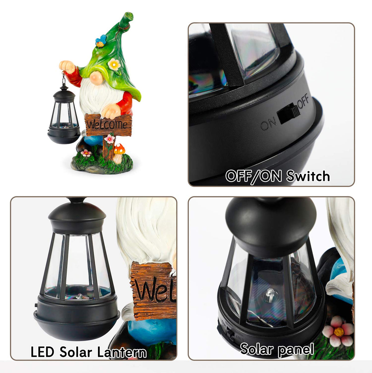 - **Easy to Use**: This gnome features a user-friendly design; simply push the OFF switch on the lantern in the gnome's hand to the ON position and let the solar panel charge during the day. It efficiently collects sunlight for 5-8 hours and automatically illuminates your garden for 8-10 hours at night, requiring no wiring or complicated setup.