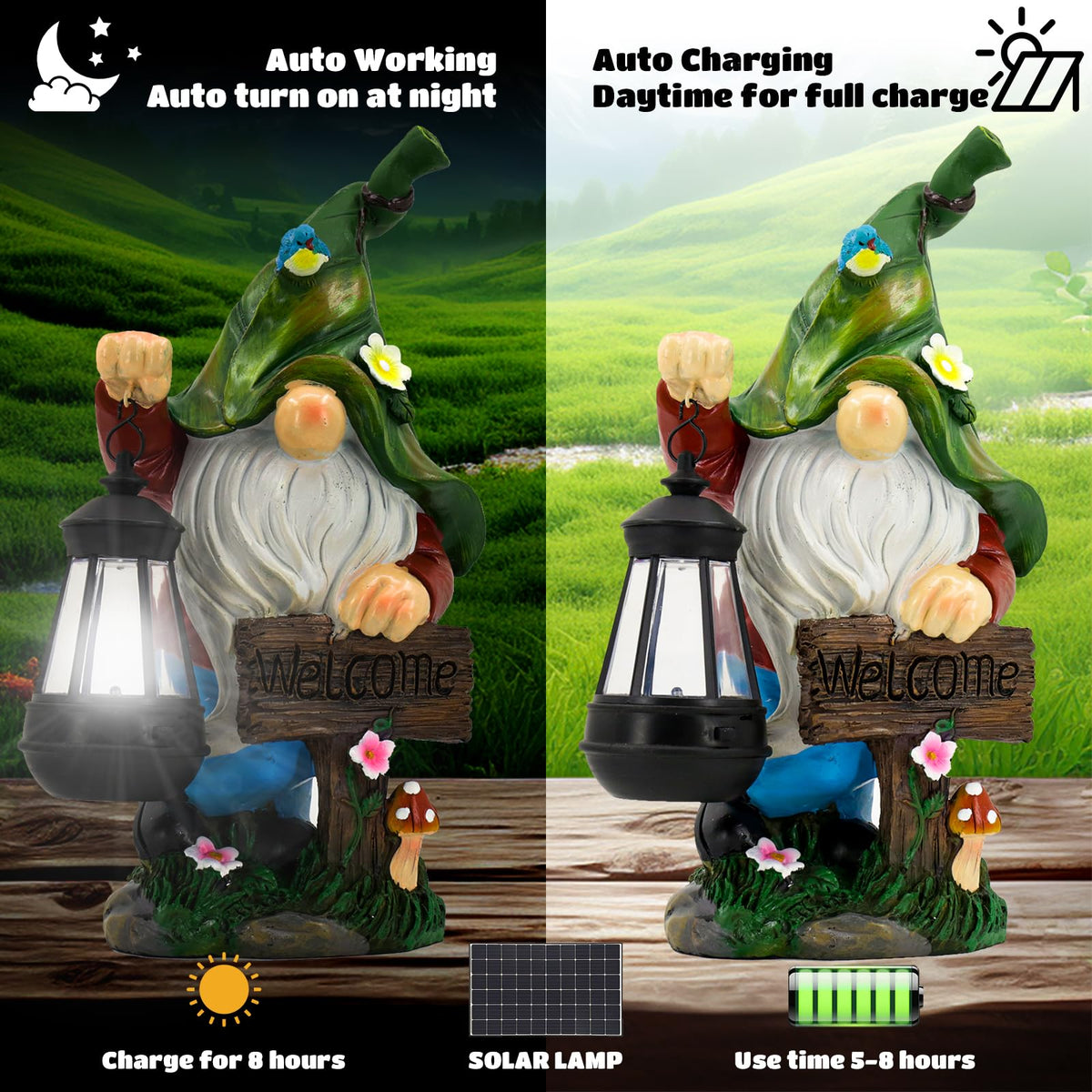 Wogoon Solar Garden Gnome Statue With Lantern & Welcome Sign, Outdoor Yard Art Decor