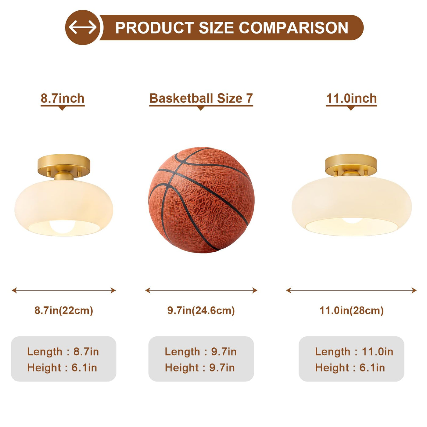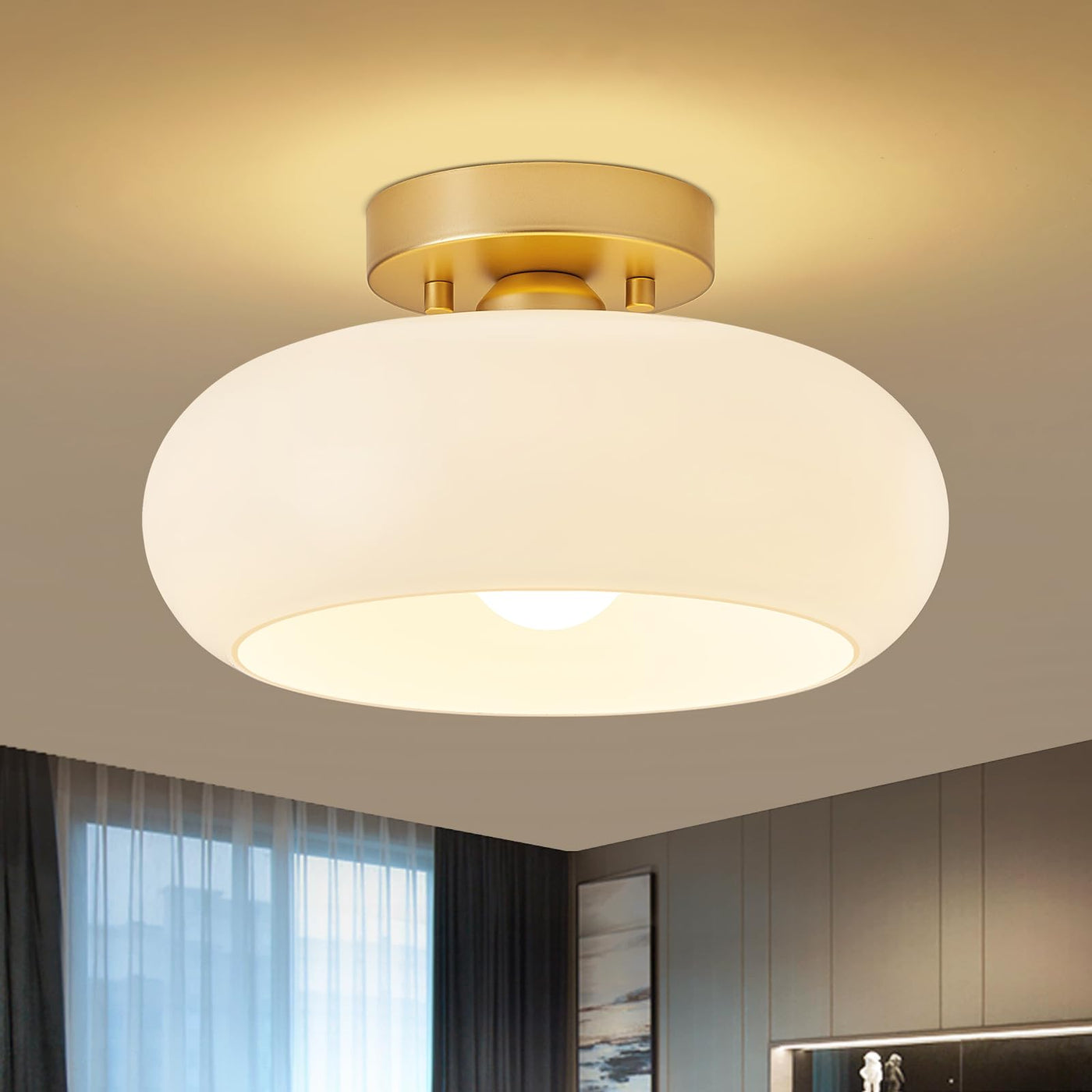 Woknos Mid-Century Modern Gold Semi Flush Mount Ceiling Light, Kitchen Ceiling Light Fixture With Glass Shade, Vintage White Clo