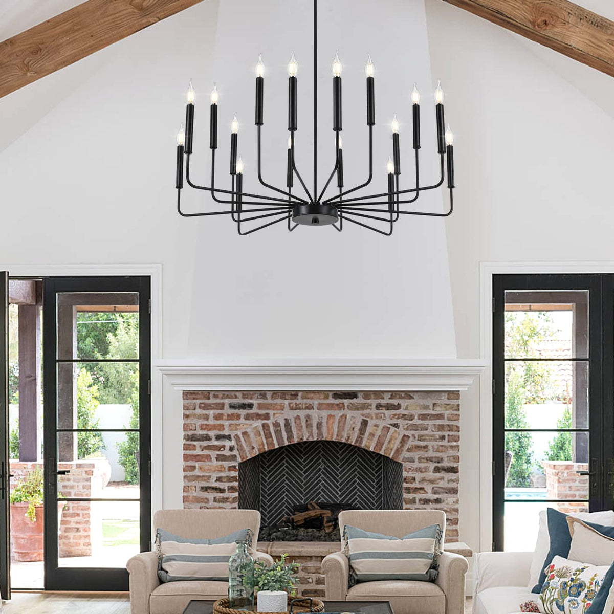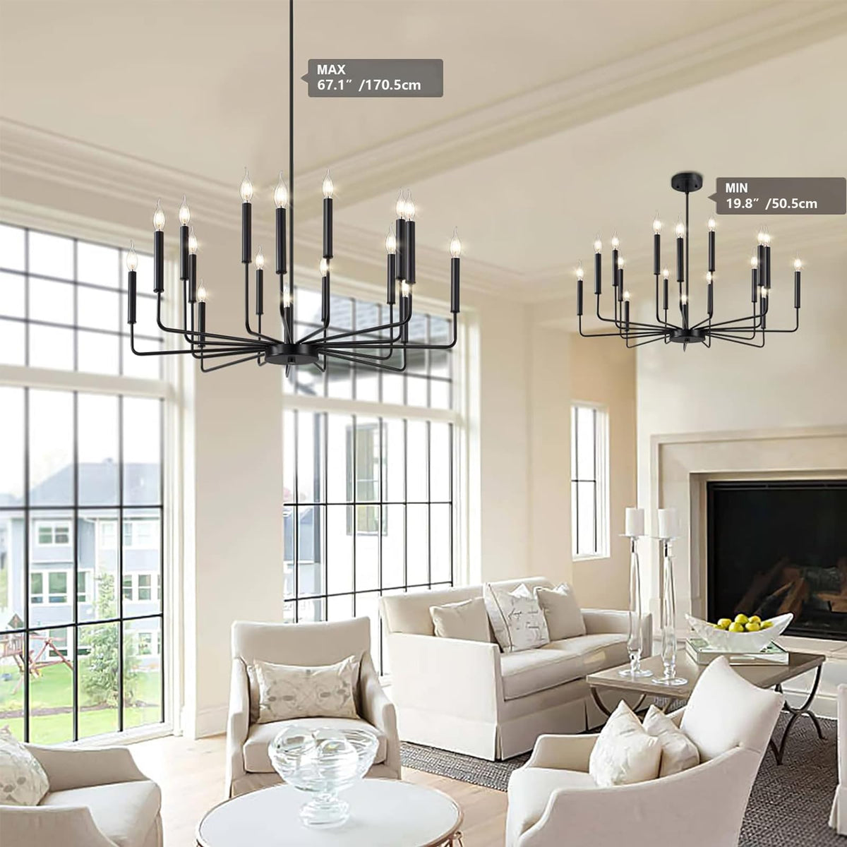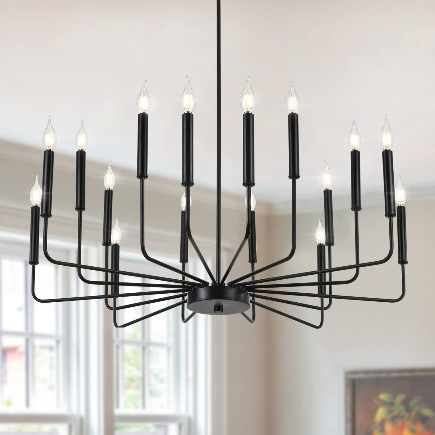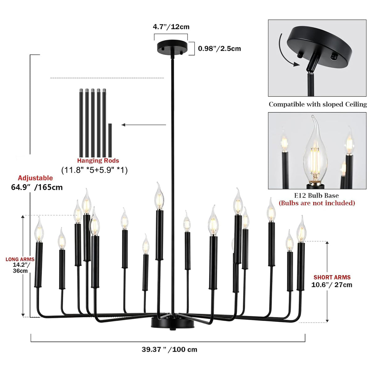 A farmhouse candelabra chandelier features 16 candle-style lights attached to arms. This simple design can illustrate a generous atmosphere to your space. Bulbs within illuminate and bring this look soft to life. Product Feature Color Temperature and Dimmable: Depend on the bulbs you are using. Made of high quality metal material, black painted, non-fading. Indoor use only. Suitable for Living room, Dining room, Bedroom, Kitchen, Restaurant, Bar etc. Product Specifications Material: Metal Fixture Diameter: 39.37in 14.2in Canopy Width: 4.7in/12cm Pole height is 70.8in/180cm(Adjustable) Suitable Voltage: 110-250V (U.S. standard) Suitable Wattage: Max 40W/Each Light Source: E12 bulb x 16 Bulb not included. Warm Tips Please turn off all power when installing this light.( For your safety, we suggest that you get a professional electrician to install it.)Bulb not included.Assembly is necessary.Clean and Care: To clean, wear gloves wipe fixture with soft cloth. Steps for usage Packaged securely: Requires self-assembly according to installation instruction and needs patience to put it together. But it will be definitely worth it when you done. About Our ServicesIf you have any questions about the light fixture, please trust us,we can offer you a satisfactory solution.QA checks and drop tests are carried out prior to leaving the factory. Package Includes 1 x Chandelier +1 x Accessories package +1 x Instruction manual WOKNOS the right chose to brighten up your atmosphere.