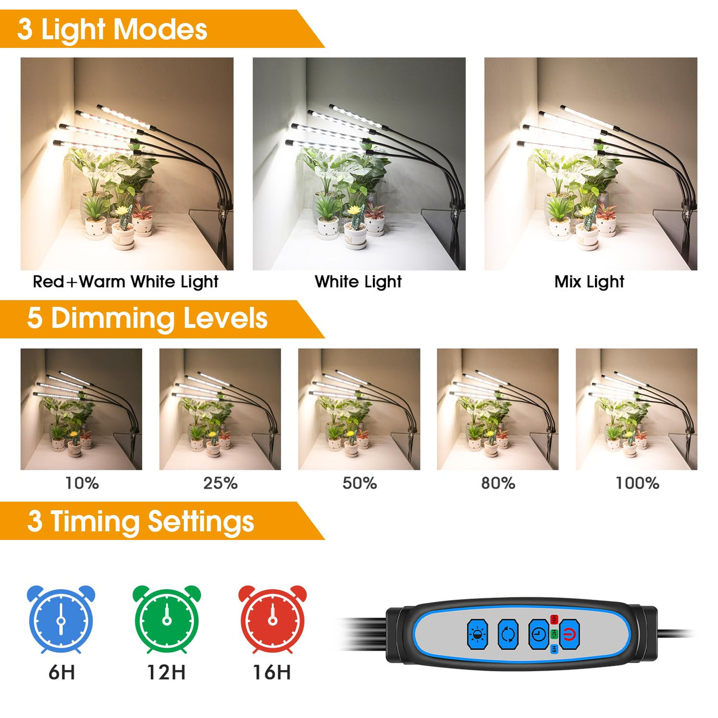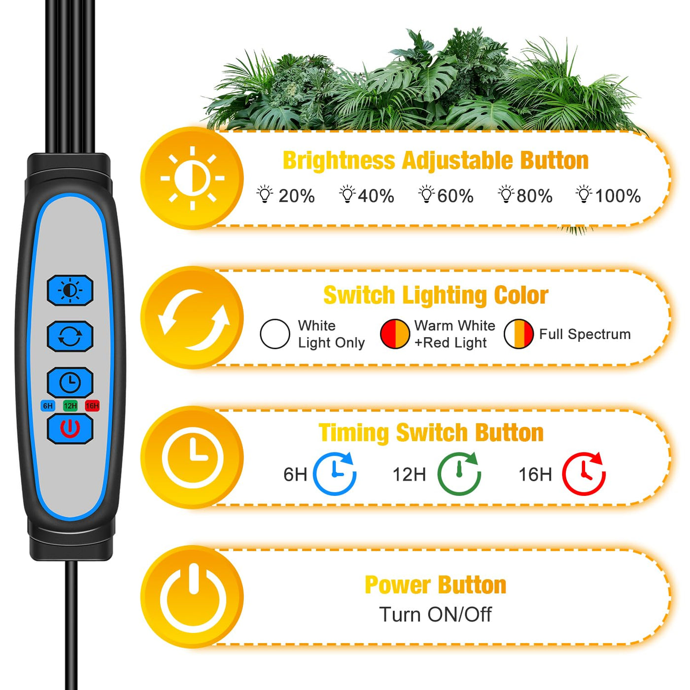 Q: How do I set the timer function on the Wolezek Grow Light?A: The grow light features a built-in auto circular-memory timer that allows you to set it for 6, 12, or 16 hours. Once programmed, it will automatically turn on and off each day according to your settings, ensuring your plants receive consistent light even when you're busy or away.