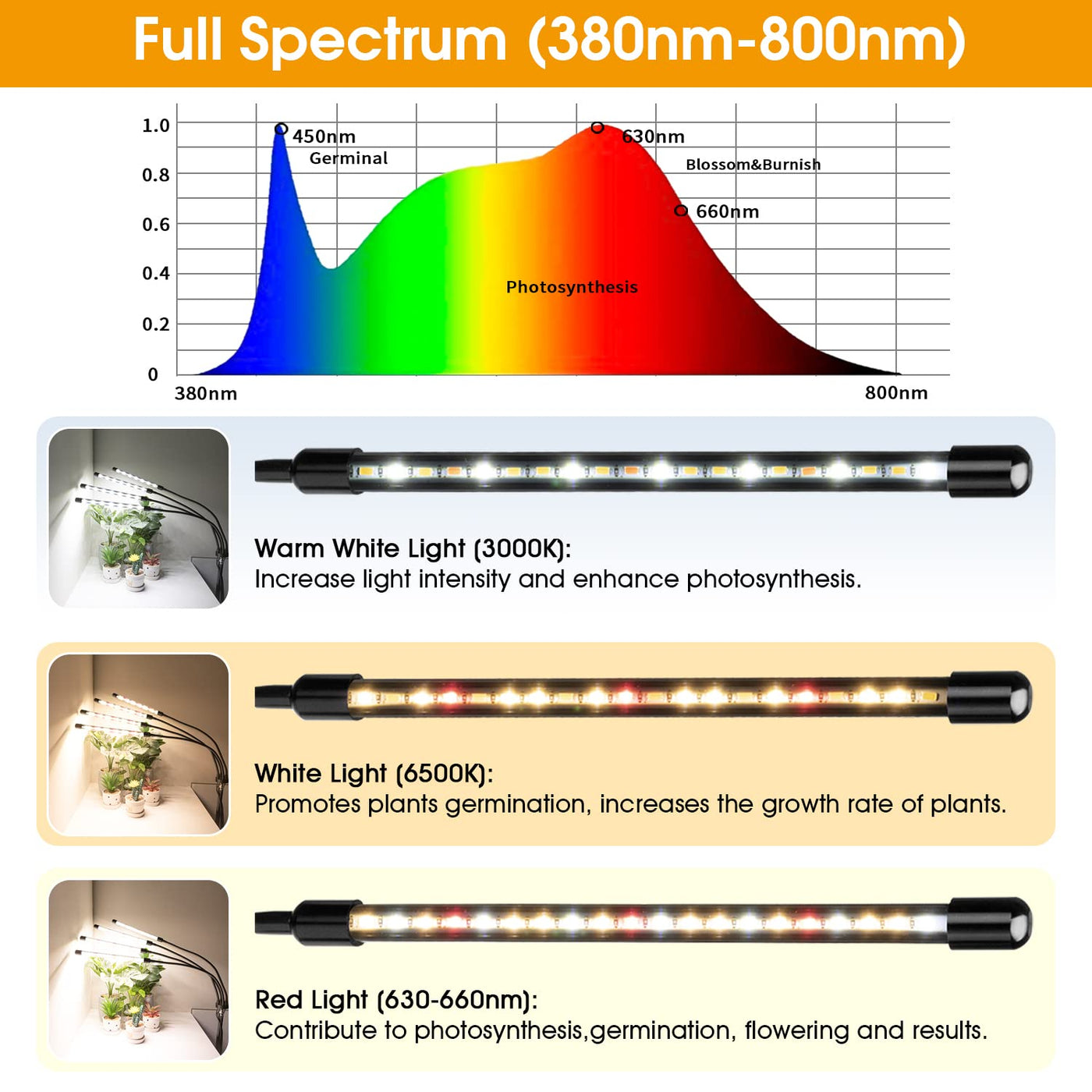 Q: What are the benefits of using the Wolezek Grow Lights for indoor plants?A: The Wolezek Grow Lights provide full spectrum lighting, which includes 3000K warm white, 6500K cold white, and 660nm red light. This combination promotes plant growth at all stages, enhances photosynthesis, and encourages flowering and fruiting. It's especially beneficial for indoor plants that may not receive adequate natural sunlight.