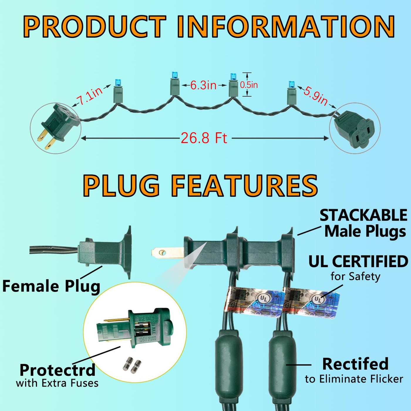 Q: What are the key features of the Wominoy Aqua LED Christmas Lights?A: The Wominoy Aqua LED Christmas Lights feature 50 counts of 5mm wide angle stable aqua LED lights spaced 6.3 inches apart, a durable green wire, and a commercial-grade design that is UL listed for both indoor and outdoor use.