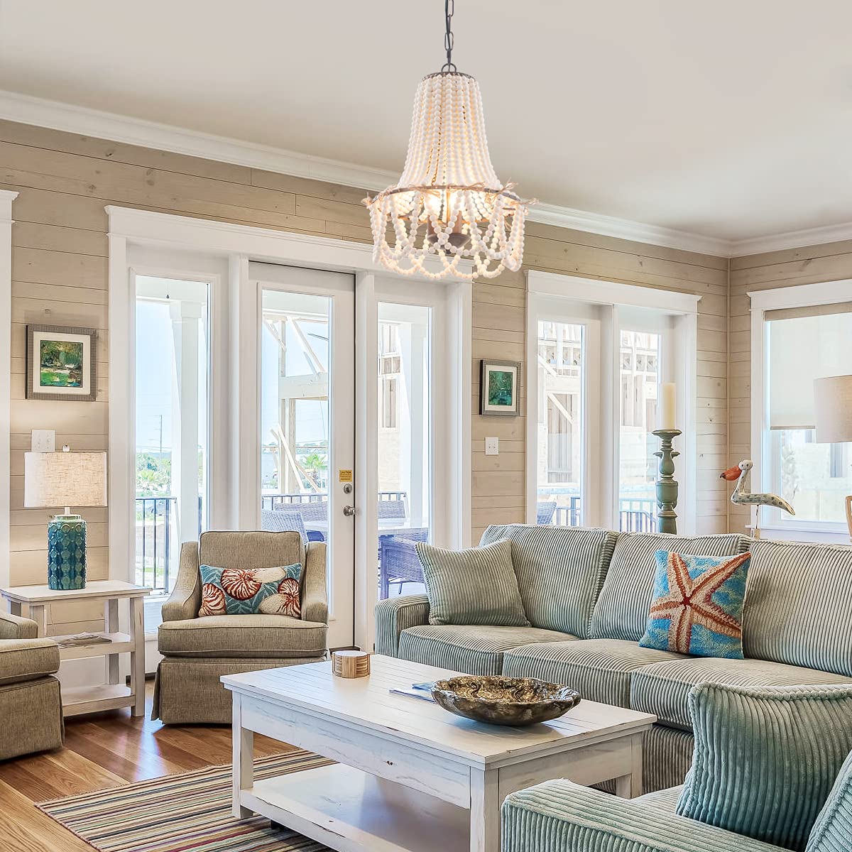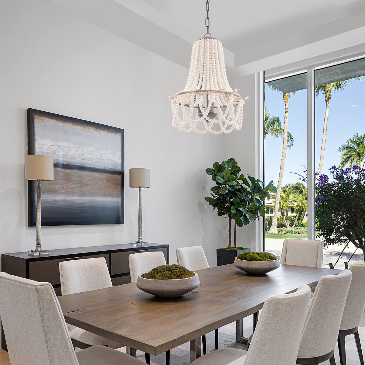 Wood Beaded Chandelier 3-Light Bohemia Pendant Light Fixture Farmhouse Round Hanging Chandelier White Beads With Black Chain For