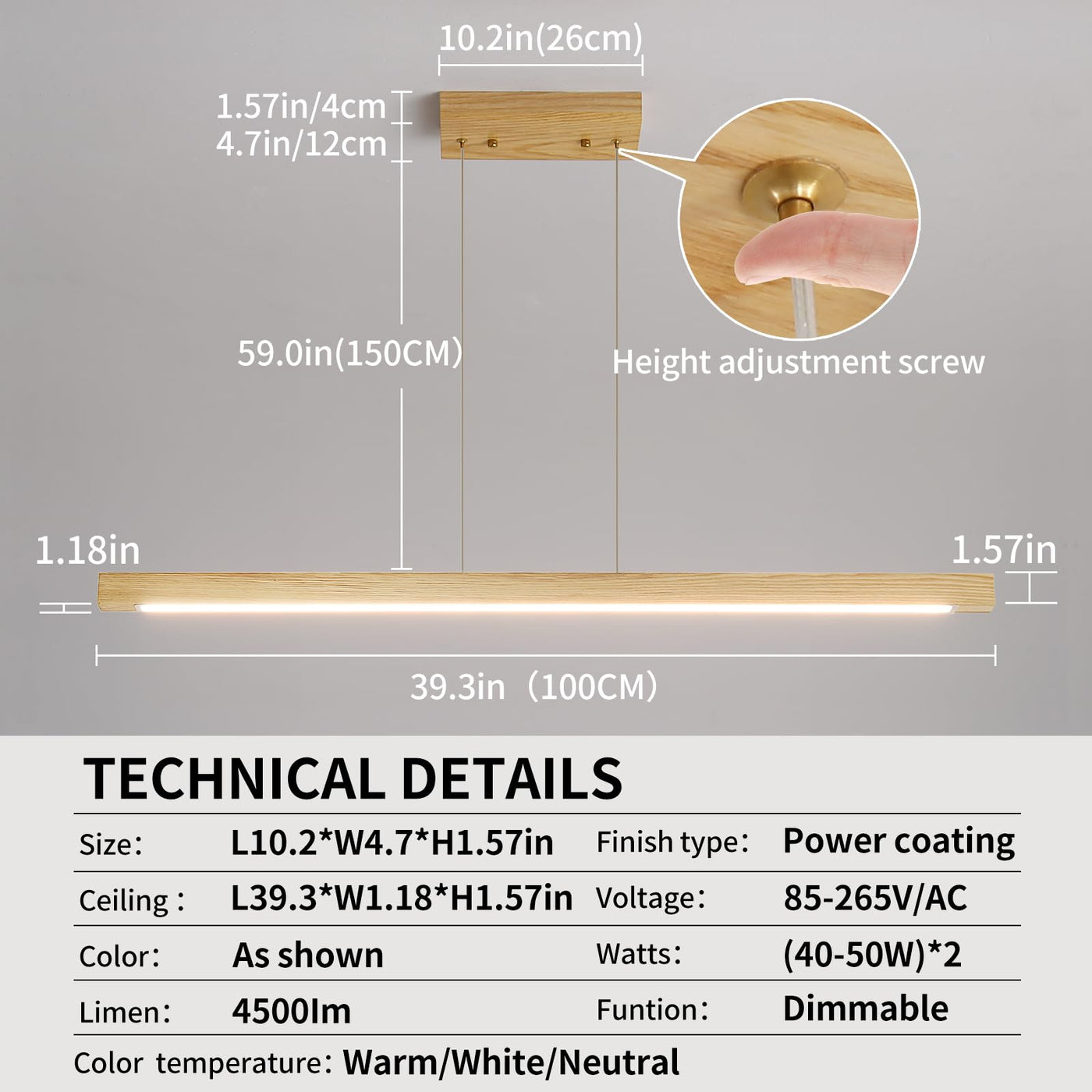 Wooden Linear Pendant Light, 39'' Modern Chandeliers For Dining Room, Dimmable Pool Table Island Lights For Kitchen, Led Ceiling