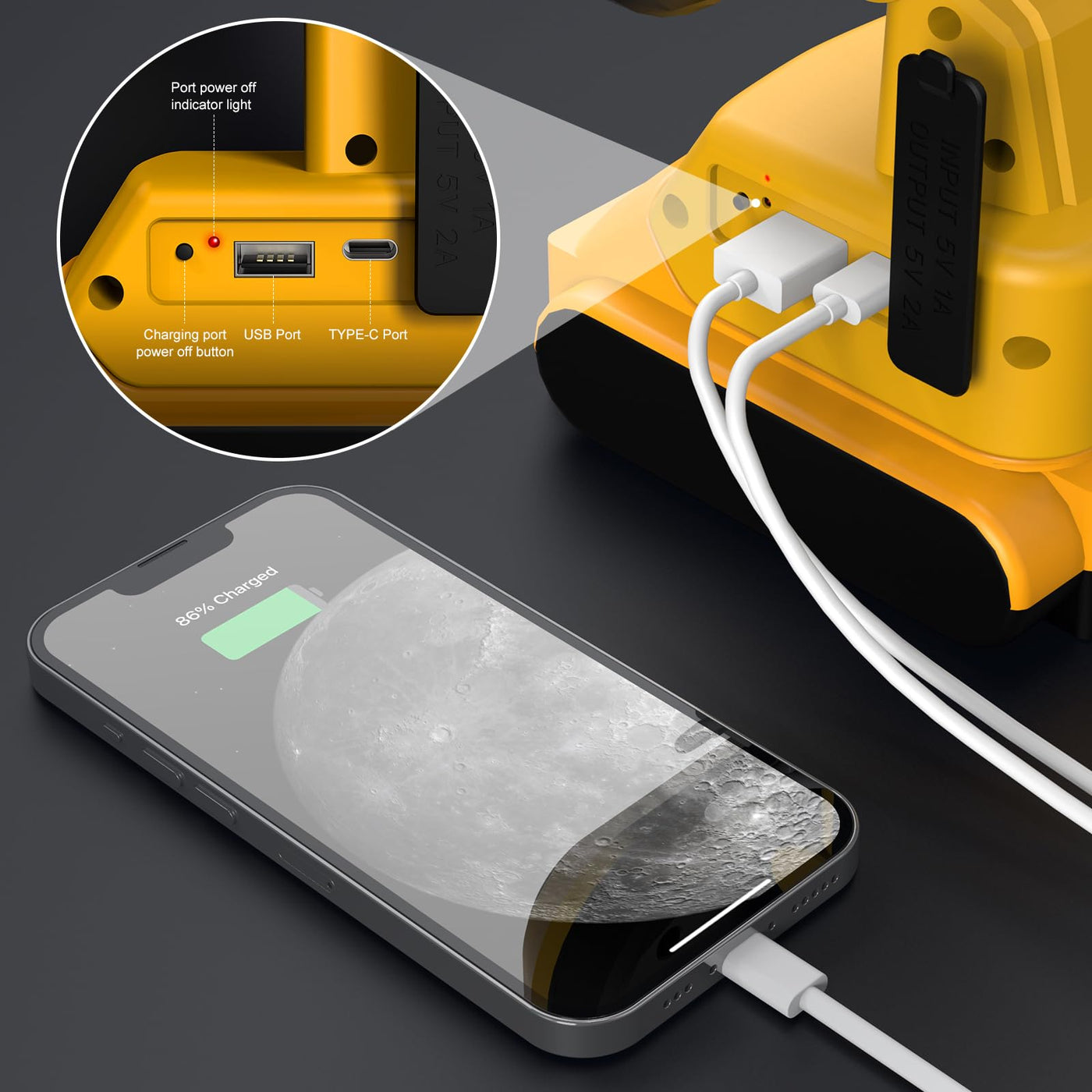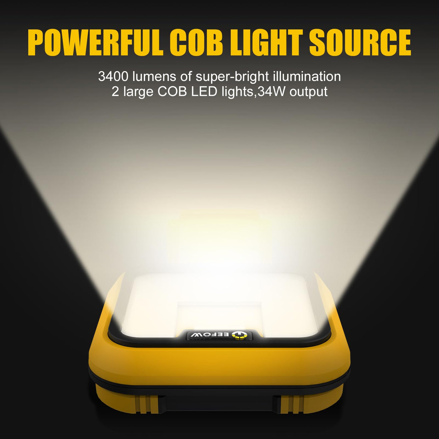 Product Name: Eefow Led Work Light For Dewalt 20V Max Rechargeable Battery, 64W 6400Lm, With Usb And Type C Charging Port,Suitable For Outdoor And Workplace Lighting Warm Tip: This Work Light Does Not Come With Batteries And Is Not Manufactured Or Sold By Dewalt. Battery Powered : Eefow 20V Max Led Work Light For Dewalt 18V/20V Lithium-Ion Batteries Dcb206 Dcb205 Dcb204 Dcb181 Dcb182 Dcb200 Dcb203 Dcb205-2 Dcb204-2 Dcb206-2 And More. Easy To Use Even When There Is No Power Supply Outdoors, As Long As You Bring Batteries. And You No Longer Need To Be Tethered To An Outlet Or Struggle With Tangled Cords, Making It Easy To Work In Tight Spaces, On Job Sites, Or Outdoors. Comprehensive Battery Protection Design: 1. Led Work Light Smart Chip: By Utilizing A Smart Chip To Monitor The Battery Voltage, It Ensures That The Led Work Light Automatically Ceases Operation When The Voltage Drops Below 15V. &Nbsp;2. Energy-Saving Mode: Upon Pressing The Usb Power-Off Button, The System May Enter An Energy-Saving Mode, Shutting Down Unnecessary Circuits To Reduce The Battery'S Self-Discharge Rate. Product Material: Abs Size: 6*3.5*7.8 Weight: 15.8Oz Lumens: High Brightness 6400 Lumens, Low Brightness 1700 Lumens Light Color: White Light 6000 K-6500 K, Yellow Light 2800-3200 K Lighting Gears: White Light Strong, White Light Weak, Yellow Light Strong, Yellow Light Weak Charging Port: Ubs, Type-C Dual Charging Port Product Details: Led Light*1 Instruction Manual*1