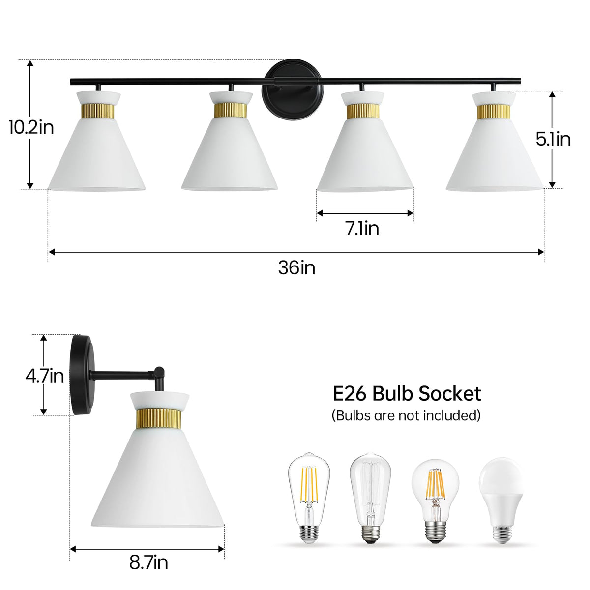 WOSHITU Bathroom Vanity Light Fixtures: 4-Light Mid Century Modern Vanity Lights for Bathroom Over Mirror, Black and Gold Wall S