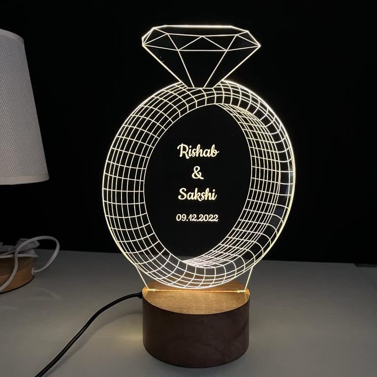 WOWOOD Anniversary Gift For Couple Wedding Gift LED Lamp Love Night Light (3D Ring Design, Wood, Warm White, Pack Of 1)