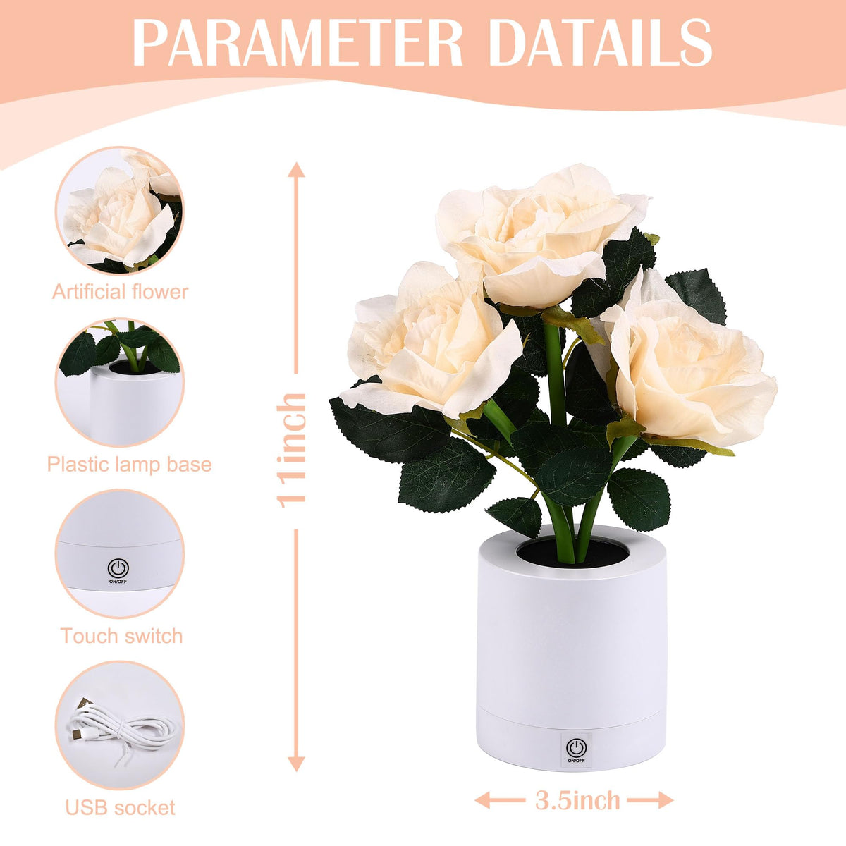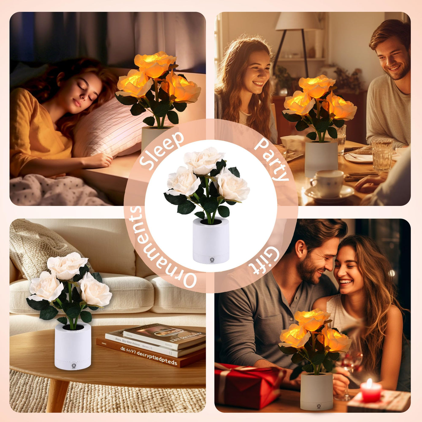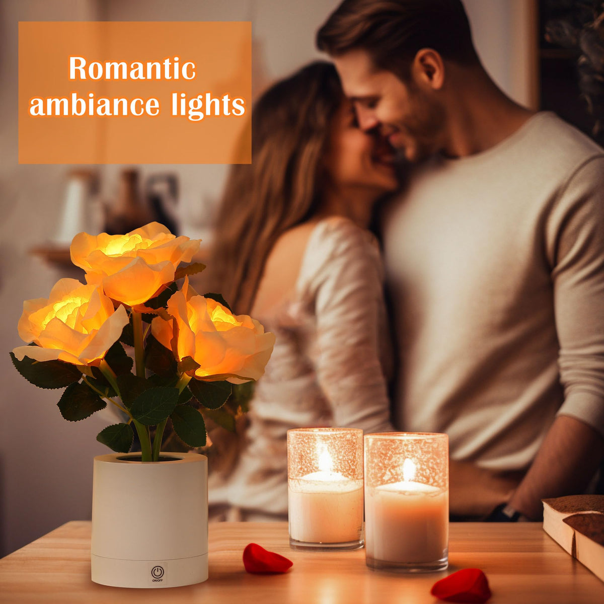 Q: What type of ambiance does the lamp create?A: The lamp creates a romantic and charming atmosphere, perfect for mood lighting. Its soft pliable roses, combined with fairy lights, provide a warm glow, making it ideal for bedrooms, dining rooms, or any cozy space.