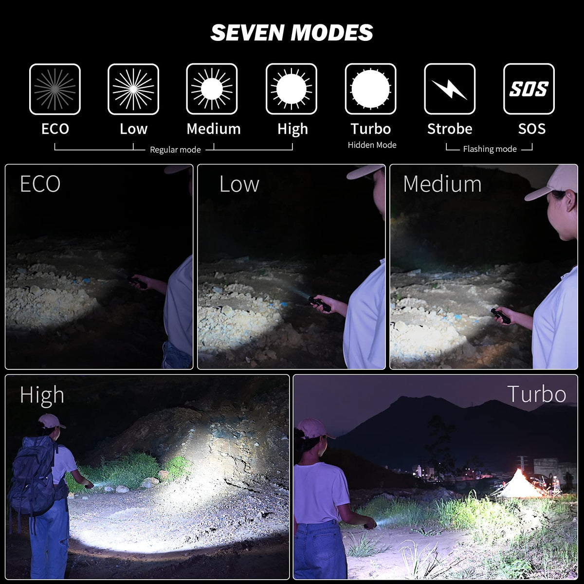 - **Versatile Lighting Modes**: The WUBEN C2 offers 7 distinct lighting modes, including 4 basic settings (High, Medium, Low, ECO), a Turbo mode for maximum brightness, and 2 flashing modes (Strobe and SOS). The memory function ensures it remembers your last used setting, while the blue breathing light helps locate it easily in the dark.