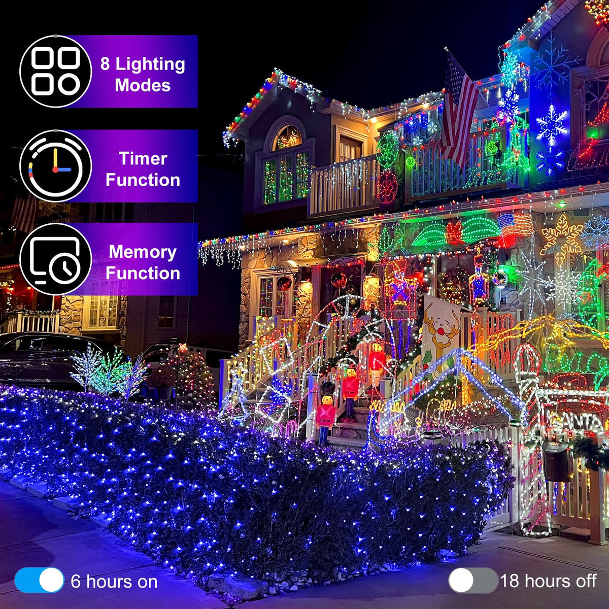 This impressive set features 1500 enhanced LEDs, ensuring a bright and long-lasting display. With 8 unique lighting modes, including Combination, In Waves, Sequential, Slo-Glo, Chasing/Flash, Slow Fade, Twinkle/Flash, and Steady On, you can tailor the lighting to suit any mood or occasion. The user-friendly design includes a simple control button on the plug, making it easy to switch between modes. Additionally, the built-in timer function allows for automated cycles of 6 hours on and 18 hours off, while a memory chip retains your last used setting for added convenience.
