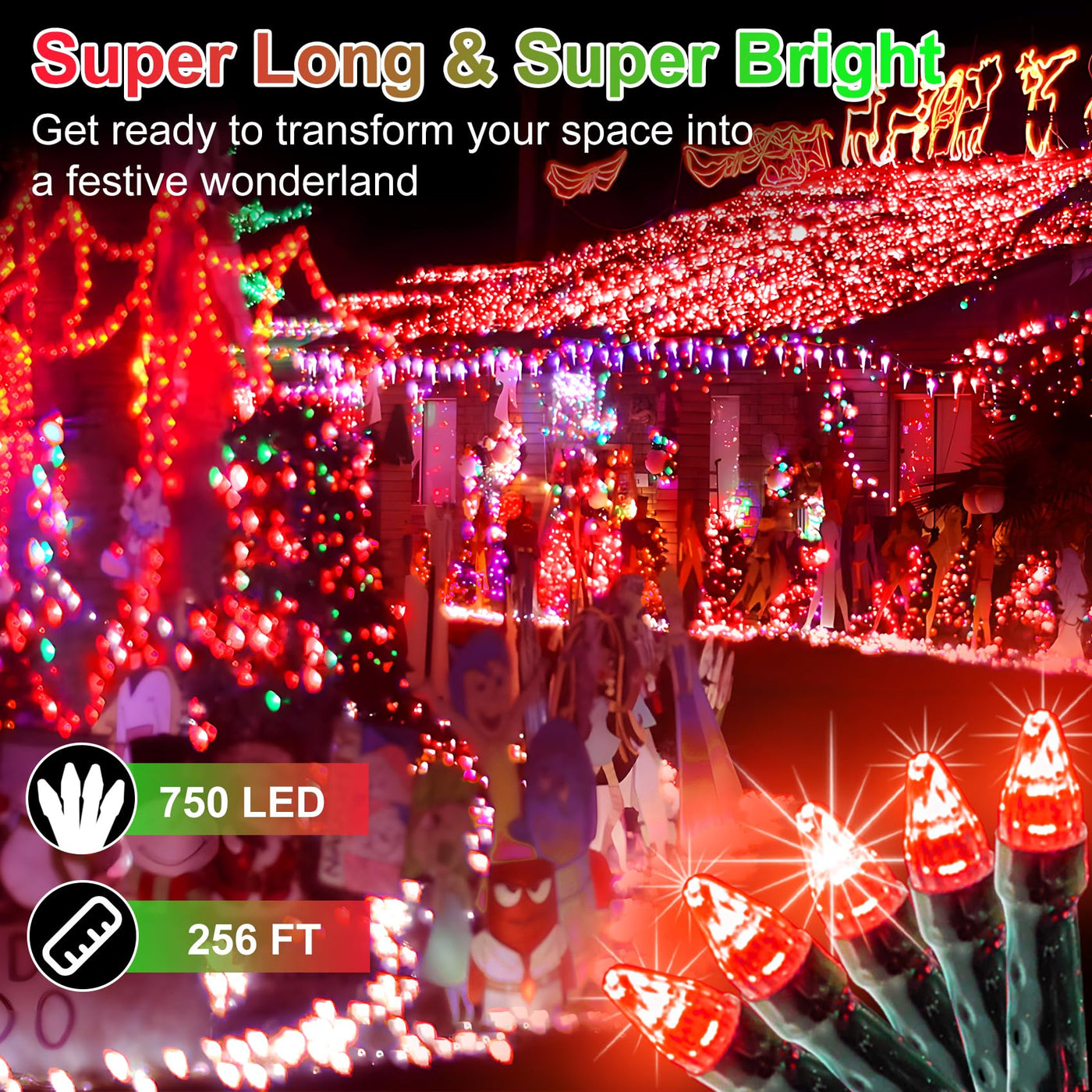 Q: What are the dimensions of the 750 LED Christmas lights?A: The Christmas lights measure 256 feet in length, making them suitable for large outdoor spaces.